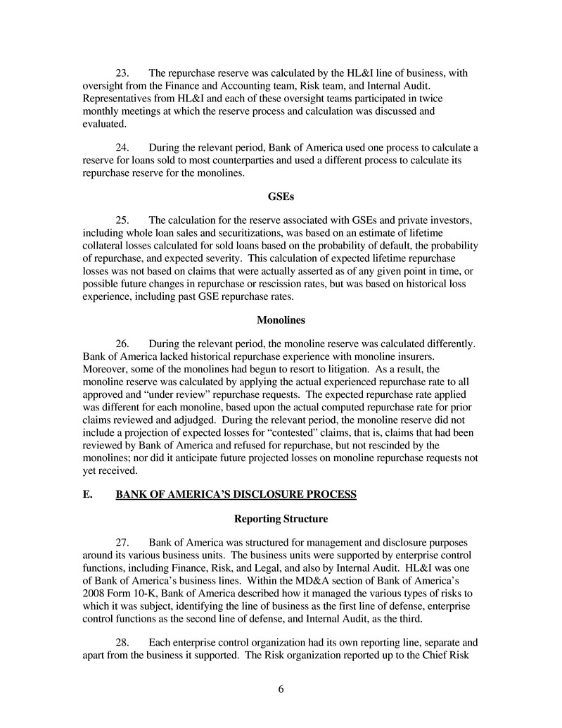 6 23. The repurchase reserve was calculated by the HL&I line of business, with oversight from the Finance and Accounting team, Risk team, and Internal Audit. Representatives from HL&I and each of these oversight teams participated in twice monthly meetings at which the reserve process and calculation was discussed and evaluated. 24. During the relevant period, Bank of America used one process to calculate a reserve for loans sold to most counterparties and used a different process to calculate its repurchase reserve for the monolines. GSEs 25. The calculation for the reserve associated with GSEs and private investors, including whole loan sales and securitizations, was based on an estimate of lifetime collateral losses calculated for sold loans based on the probability of default, the probability of repurchase, and expected severity. This calculation of expected lifetime repurchase losses was not based on claims that were actually asserted as of any given point in time, or possible future changes in repurchase or rescission rates, but was based on historical loss experience, including past GSE repurchase rates. Monolines 26. During the relevant period, the monoline reserve was calculated differently. Bank of America lacked historical repurchase experience with monoline insurers. Moreover, some of the monolines had begun to resort to litigation. As a result, the monoline reserve was calculated by applying the actual experienced repurchase rate to all approved and “under review” repurchase requests. The expected repurchase rate applied was different for each monoline, based upon the actual computed repurchase rate for prior claims reviewed and adjudged. During the relevant period, the monoline reserve did not include a projection of expected losses for “contested” claims, that is, claims that had been reviewed by Bank of America and refused for repurchase, but not rescinded by the monolines; nor did it anticipate future projected losses on monoline repurchase requests not yet received. E. BANK OF AMERICA’S DISCLOSURE PROCESS Reporting Structure 27. Bank of America was structured for management and disclosure purposes around its various business units. The business units were supported by enterprise control functions, including Finance, Risk, and Legal, and also by Internal Audit. HL&I was one of Bank of America’s business lines. Within the MD&A section of Bank of America’s 2008 Form 10-K, Bank of America described how it managed the various types of risks to which it was subject, identifying the line of business as the first line of defense, enterprise control functions as the second line of defense, and Internal Audit, as the third. 28. Each enterprise control organization had its own reporting line, separate and apart from the business it supported. The Risk organization reported up to the Chief Risk