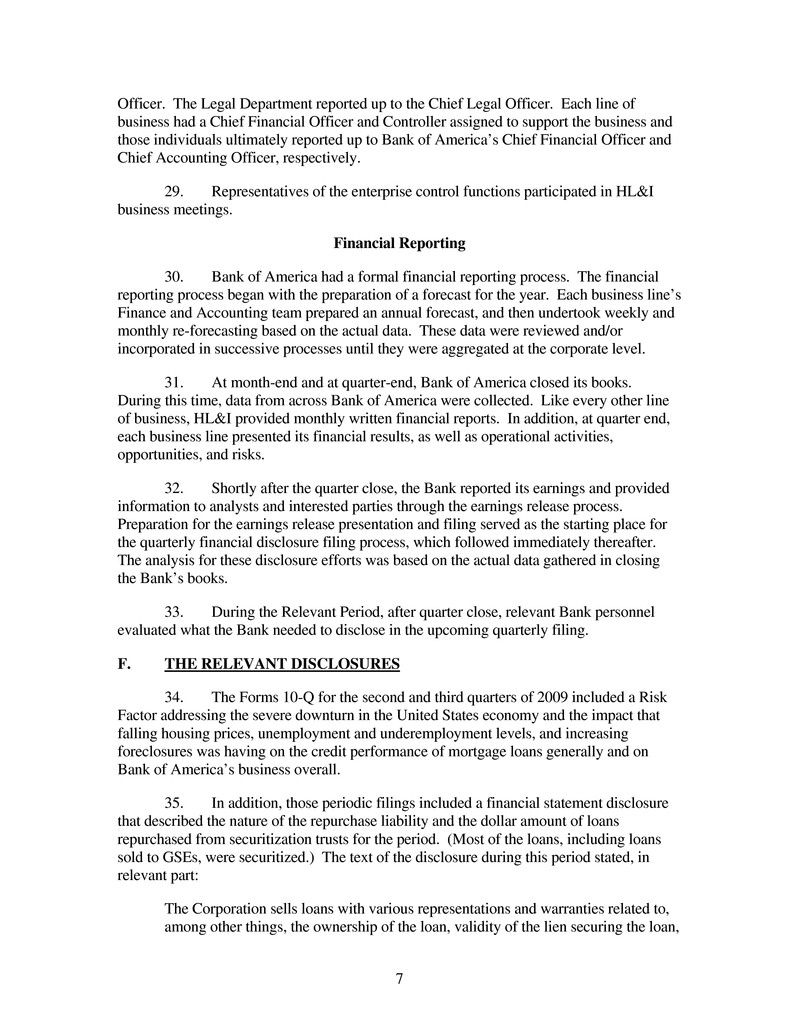 7 Officer. The Legal Department reported up to the Chief Legal Officer. Each line of business had a Chief Financial Officer and Controller assigned to support the business and those individuals ultimately reported up to Bank of America’s Chief Financial Officer and Chief Accounting Officer, respectively. 29. Representatives of the enterprise control functions participated in HL&I business meetings. Financial Reporting 30. Bank of America had a formal financial reporting process. The financial reporting process began with the preparation of a forecast for the year. Each business line’s Finance and Accounting team prepared an annual forecast, and then undertook weekly and monthly re-forecasting based on the actual data. These data were reviewed and/or incorporated in successive processes until they were aggregated at the corporate level. 31. At month-end and at quarter-end, Bank of America closed its books. During this time, data from across Bank of America were collected. Like every other line of business, HL&I provided monthly written financial reports. In addition, at quarter end, each business line presented its financial results, as well as operational activities, opportunities, and risks. 32. Shortly after the quarter close, the Bank reported its earnings and provided information to analysts and interested parties through the earnings release process. Preparation for the earnings release presentation and filing served as the starting place for the quarterly financial disclosure filing process, which followed immediately thereafter. The analysis for these disclosure efforts was based on the actual data gathered in closing the Bank’s books. 33. During the Relevant Period, after quarter close, relevant Bank personnel evaluated what the Bank needed to disclose in the upcoming quarterly filing. F. THE RELEVANT DISCLOSURES 34. The Forms 10-Q for the second and third quarters of 2009 included a Risk Factor addressing the severe downturn in the United States economy and the impact that falling housing prices, unemployment and underemployment levels, and increasing foreclosures was having on the credit performance of mortgage loans generally and on Bank of America’s business overall. 35. In addition, those periodic filings included a financial statement disclosure that described the nature of the repurchase liability and the dollar amount of loans repurchased from securitization trusts for the period. (Most of the loans, including loans sold to GSEs, were securitized.) The text of the disclosure during this period stated, in relevant part: The Corporation sells loans with various representations and warranties related to, among other things, the ownership of the loan, validity of the lien securing the loan,