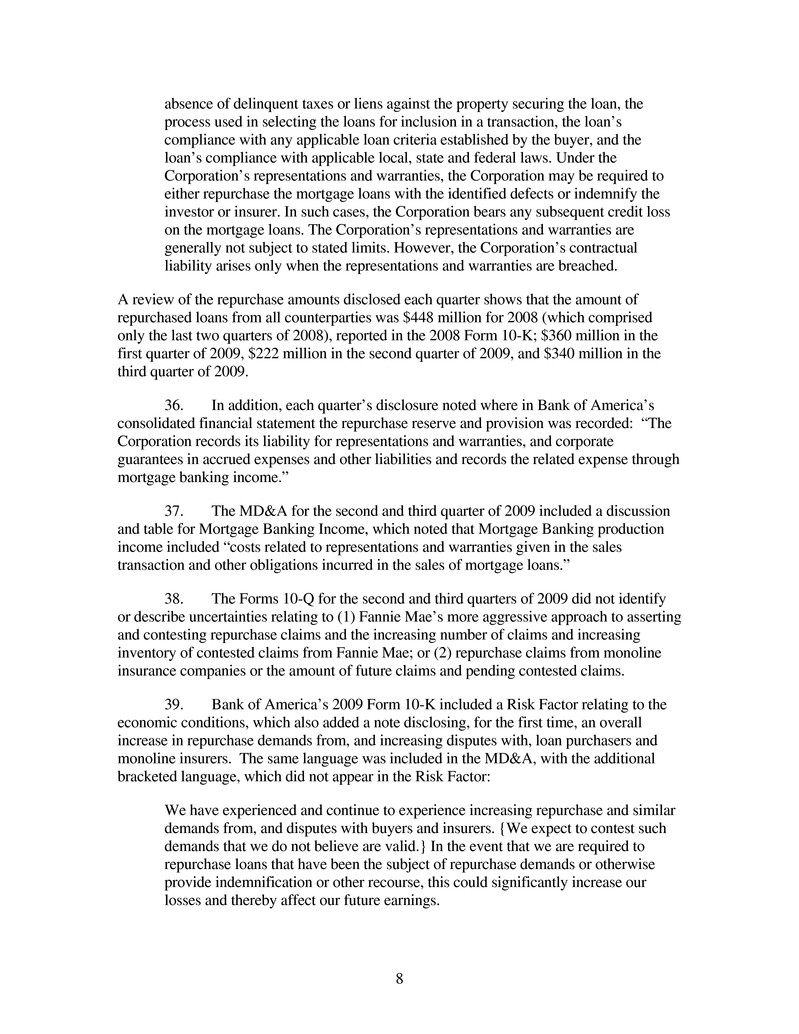 8 absence of delinquent taxes or liens against the property securing the loan, the process used in selecting the loans for inclusion in a transaction, the loan’s compliance with any applicable loan criteria established by the buyer, and the loan’s compliance with applicable local, state and federal laws. Under the Corporation’s representations and warranties, the Corporation may be required to either repurchase the mortgage loans with the identified defects or indemnify the investor or insurer. In such cases, the Corporation bears any subsequent credit loss on the mortgage loans. The Corporation’s representations and warranties are generally not subject to stated limits. However, the Corporation’s contractual liability arises only when the representations and warranties are breached. A review of the repurchase amounts disclosed each quarter shows that the amount of repurchased loans from all counterparties was $448 million for 2008 (which comprised only the last two quarters of 2008), reported in the 2008 Form 10-K; $360 million in the first quarter of 2009, $222 million in the second quarter of 2009, and $340 million in the third quarter of 2009. 36. In addition, each quarter’s disclosure noted where in Bank of America’s consolidated financial statement the repurchase reserve and provision was recorded: “The Corporation records its liability for representations and warranties, and corporate guarantees in accrued expenses and other liabilities and records the related expense through mortgage banking income.” 37. The MD&A for the second and third quarter of 2009 included a discussion and table for Mortgage Banking Income, which noted that Mortgage Banking production income included “costs related to representations and warranties given in the sales transaction and other obligations incurred in the sales of mortgage loans.” 38. The Forms 10-Q for the second and third quarters of 2009 did not identify or describe uncertainties relating to (1) Fannie Mae’s more aggressive approach to asserting and contesting repurchase claims and the increasing number of claims and increasing inventory of contested claims from Fannie Mae; or (2) repurchase claims from monoline insurance companies or the amount of future claims and pending contested claims. 39. Bank of America’s 2009 Form 10-K included a Risk Factor relating to the economic conditions, which also added a note disclosing, for the first time, an overall increase in repurchase demands from, and increasing disputes with, loan purchasers and monoline insurers. The same language was included in the MD&A, with the additional bracketed language, which did not appear in the Risk Factor: We have experienced and continue to experience increasing repurchase and similar demands from, and disputes with buyers and insurers. {We expect to contest such demands that we do not believe are valid.} In the event that we are required to repurchase loans that have been the subject of repurchase demands or otherwise provide indemnification or other recourse, this could significantly increase our losses and thereby affect our future earnings.