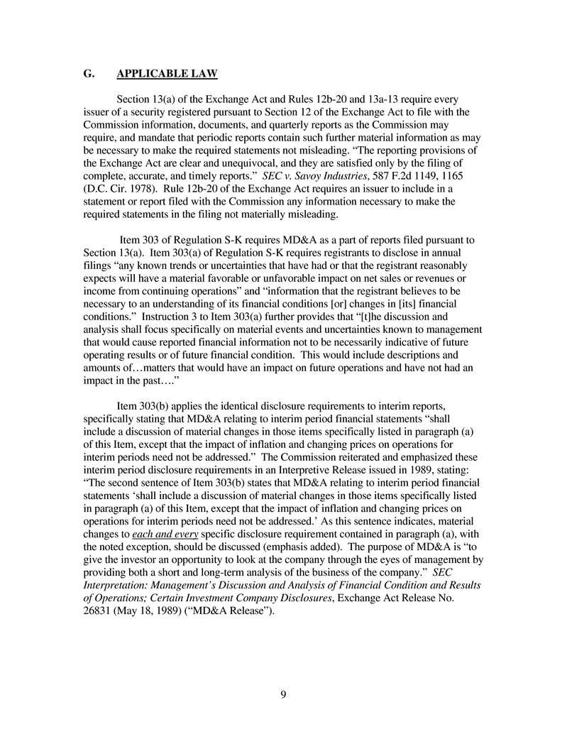 9 G. APPLICABLE LAW Section 13(a) of the Exchange Act and Rules 12b-20 and 13a-13 require every issuer of a security registered pursuant to Section 12 of the Exchange Act to file with the Commission information, documents, and quarterly reports as the Commission may require, and mandate that periodic reports contain such further material information as may be necessary to make the required statements not misleading. “The reporting provisions of the Exchange Act are clear and unequivocal, and they are satisfied only by the filing of complete, accurate, and timely reports.” SEC v. Savoy Industries, 587 F.2d 1149, 1165 (D.C. Cir. 1978). Rule 12b-20 of the Exchange Act requires an issuer to include in a statement or report filed with the Commission any information necessary to make the required statements in the filing not materially misleading. Item 303 of Regulation S-K requires MD&A as a part of reports filed pursuant to Section 13(a). Item 303(a) of Regulation S-K requires registrants to disclose in annual filings “any known trends or uncertainties that have had or that the registrant reasonably expects will have a material favorable or unfavorable impact on net sales or revenues or income from continuing operations” and “information that the registrant believes to be necessary to an understanding of its financial conditions [or] changes in [its] financial conditions.” Instruction 3 to Item 303(a) further provides that “[t]he discussion and analysis shall focus specifically on material events and uncertainties known to management that would cause reported financial information not to be necessarily indicative of future operating results or of future financial condition. This would include descriptions and amounts of…matters that would have an impact on future operations and have not had an impact in the past….” Item 303(b) applies the identical disclosure requirements to interim reports, specifically stating that MD&A relating to interim period financial statements “shall include a discussion of material changes in those items specifically listed in paragraph (a) of this Item, except that the impact of inflation and changing prices on operations for interim periods need not be addressed.” The Commission reiterated and emphasized these interim period disclosure requirements in an Interpretive Release issued in 1989, stating: “The second sentence of Item 303(b) states that MD&A relating to interim period financial statements ‘shall include a discussion of material changes in those items specifically listed in paragraph (a) of this Item, except that the impact of inflation and changing prices on operations for interim periods need not be addressed.’ As this sentence indicates, material changes to each and every specific disclosure requirement contained in paragraph (a), with the noted exception, should be discussed (emphasis added). The purpose of MD&A is “to give the investor an opportunity to look at the company through the eyes of management by providing both a short and long-term analysis of the business of the company.” SEC Interpretation: Management’s Discussion and Analysis of Financial Condition and Results of Operations; Certain Investment Company Disclosures, Exchange Act Release No. 26831 (May 18, 1989) (“MD&A Release”).