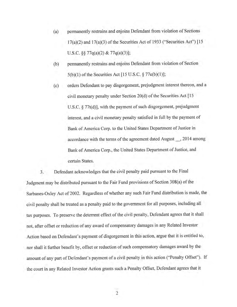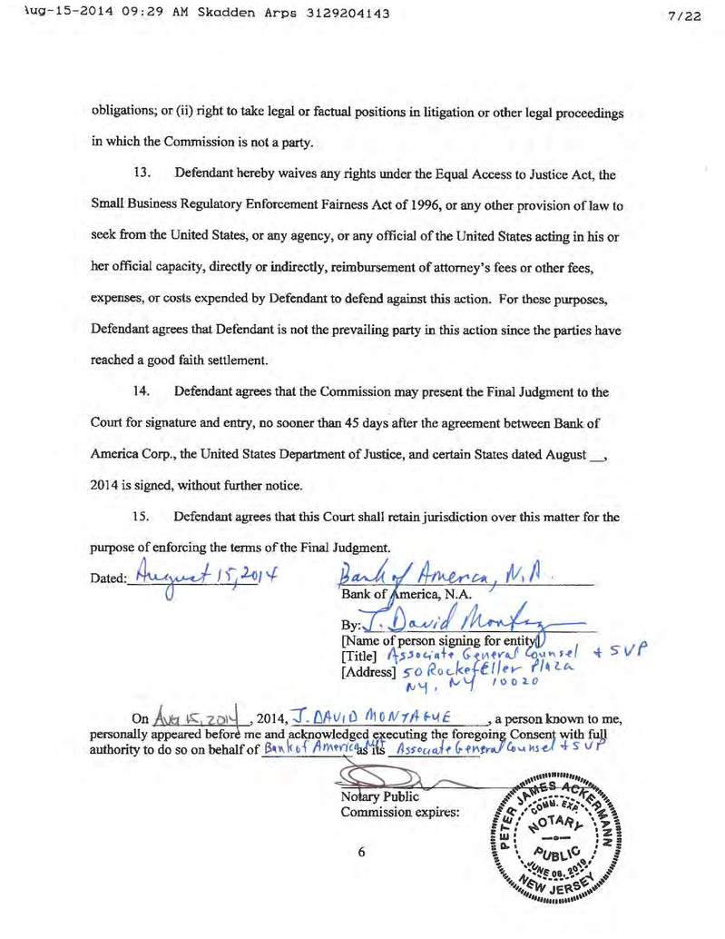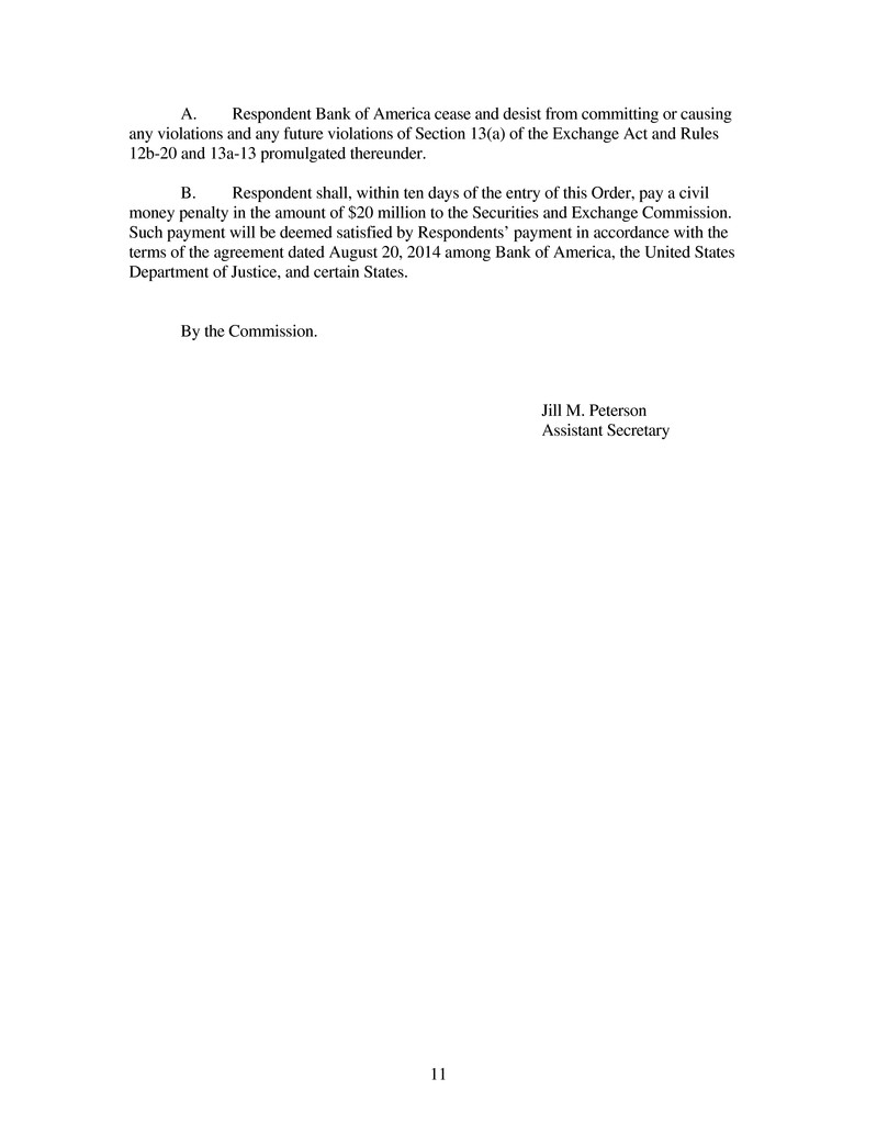 11 A. Respondent Bank of America cease and desist from committing or causing any violations and any future violations of Section 13(a) of the Exchange Act and Rules 12b-20 and 13a-13 promulgated thereunder. B. Respondent shall, within ten days of the entry of this Order, pay a civil money penalty in the amount of $20 million to the Securities and Exchange Commission. Such payment will be deemed satisfied by Respondents’ payment in accordance with the terms of the agreement dated August 20, 2014 among Bank of America, the United States Department of Justice, and certain States. By the Commission. Jill M. Peterson Assistant Secretary
