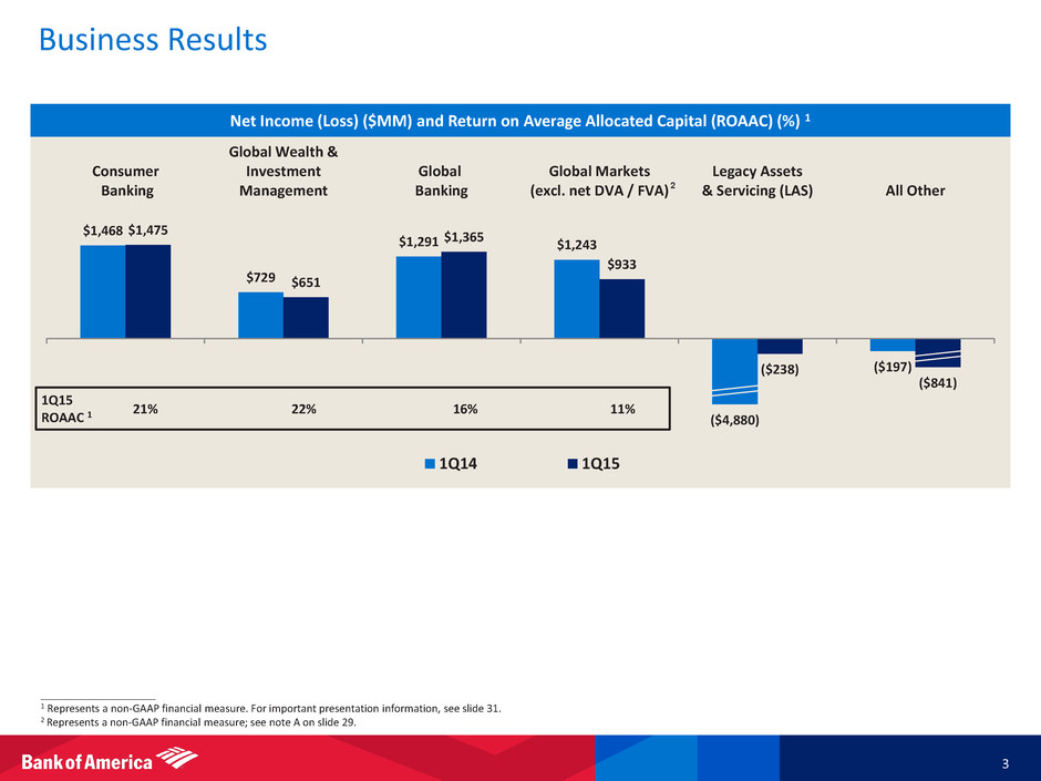 1Q15 Highlights 2 • Net income of $3.4B in 1Q15, up versus $3.1B in 4Q14 and ($0.3B) in 1Q14 • Increased capital and liquidity measures • Authorized a $4B common stock repurchase program • Managed expenses well • Generated modest growth in core loans • Continued progress on key metrics in several businesses