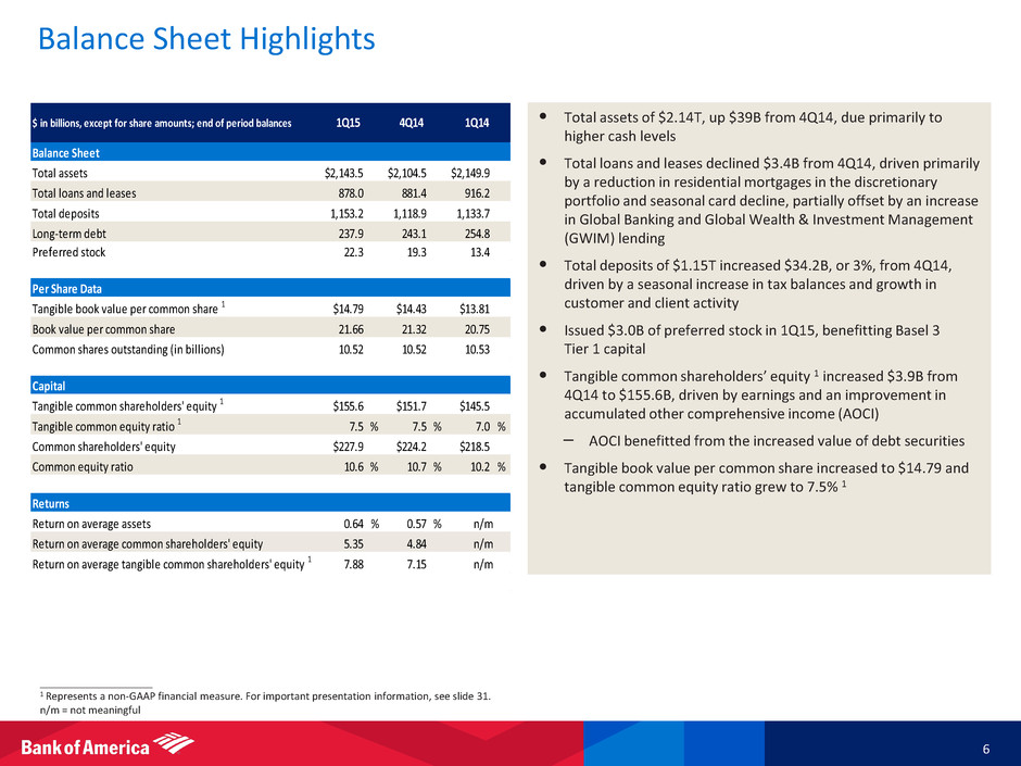 1Q15 Results 5 ____________________ Note: Amounts may not total due to rounding. 1 FTE basis. Represents a non-GAAP financial measure; see note B on slide 29. 2 See note J on slide 29 for definition of market-related NII adjustments. 3 See note A on slide 29. 4 Represents a non-GAAP financial measure; see note C on slide 29. 5 Represents a non-GAAP financial measure. Summary Income Statement • First quarter 2015 reported earnings per diluted common share of $0.27 • Pre-tax results included the following items: – $1.0B annual retirement-eligible incentive costs, or $0.06 per share (recorded in both 1Q15 and 1Q14) – $0.5B negative market-related adjustments to net interest income, or $0.03 per share, driven by the acceleration of bond premium amortization on debt securities due to lower long-term rates • Excluding market-related NII adjustments, net DVA / FVA 3 and equity investment income, revenue of $21.9B, up 8% from 4Q14 and down 1% from 1Q14 1, 4 • Excluding litigation expense and annual retirement-eligible incentive costs, expenses up 4% from 4Q14 and down 6% from 1Q14 5 $ in billions, except per share data 1Q15 4Q14 1Q14 Net interest income 1 $9.7 ($0.2) ($0.6) Noninterest income 11.8 2.7 (0.7) Total revenue, net of interest expense 1 21.4 2.5 (1.3) Noninterest expense 15.7 1.5 (6.5) Pre-tax, pre-provision earnings 1 5.7 1.0 5.2 Provision for credit losses 0.8 0.5 (0.2) Income before income taxes 1 5.0 0.4 5.4 Income tax expense 1 1.6 0.1 1.8 Ne income $3.4 $0.3 $3.6 Diluted earnings per common share $0.27 $0.02 $0.320 0 Average diluted common shares (in billions) 11.27 (0.01) 0.71 Inc / (Dec) Selected Revenue Items ($B) 1Q15 4Q14 1Q14 Total revenue 1 $21.4 $19.0 $22.8 Market-related NII adjustments 2 (0.5) (0.6) (0.3) Net DVA / FVA impact 3 0.0 (0.6) 0.1 Equity investment income (loss) 0.0 (0.0) 0.8 Selected Expense Item ($B) 1Q15 4Q14 1Q14 Noninterest expense $15.7 $14.2 $22.2 Litigation expense 0.4 0.4 6.0