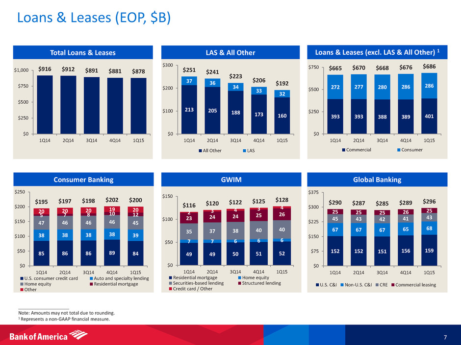 ____________________ 1 Represents a non-GAAP financial measure. For important presentation information, see slide 31. n/m = not meaningful Balance Sheet Highlights 6 • Total assets of $2.14T, up $39B from 4Q14, due primarily to higher cash levels • Total loans and leases declined $3.4B from 4Q14, driven primarily by a reduction in residential mortgages in the discretionary portfolio and seasonal card decline, partially offset by an increase in Global Banking and Global Wealth & Investment Management (GWIM) lending • Total deposits of $1.15T increased $34.2B, or 3%, from 4Q14, driven by a seasonal increase in tax balances and growth in customer and client activity • Issued $3.0B of preferred stock in 1Q15, benefitting Basel 3 Tier 1 capital • Tangible common shareholders’ equity 1 increased $3.9B from 4Q14 to $155.6B, driven by earnings and an improvement in accumulated other comprehensive income (AOCI) – AOCI benefitted from the increased value of debt securities • Tangible book value per common share increased to $14.79 and tangible common equity ratio grew to 7.5% 1 $ in billions, except for share amounts; end of period balances Balance Sheet Total assets $2,143.5 $2,104.5 $2,149.9 Total loans and leases 878.0 881.4 916.2 Total deposits 1,153.2 1,118.9 1,133.7 Long-term debt 237.9 243.1 254.8 Preferred stock 22.3 19.3 13.4 Per Share Data Tangible book value per common share 1 $14.79 $14.43 $13.81 Book value per common share 21.66 21.32 20.75 Common shares outstanding (in billions) 10.52 10.52 10.53 Capital Tangible common shareholders' equity 1 $155.6 $151.7 $145.5 Tangible common equity ratio 1 7.5 % 7.5 % 7.0 % Common shareholders' equity $227.9 $224.2 $218.5 Common equity ratio 10.6 % 10.7 % 10.2 % Returns Return on average assets 0.64 % 0.57 % n/m Return on average common shareholders' equity 5.35 4.84 n/m Return on average tangible common shareholders' equity 1 7.88 7.15 n/m 1Q15 4Q14 1Q14