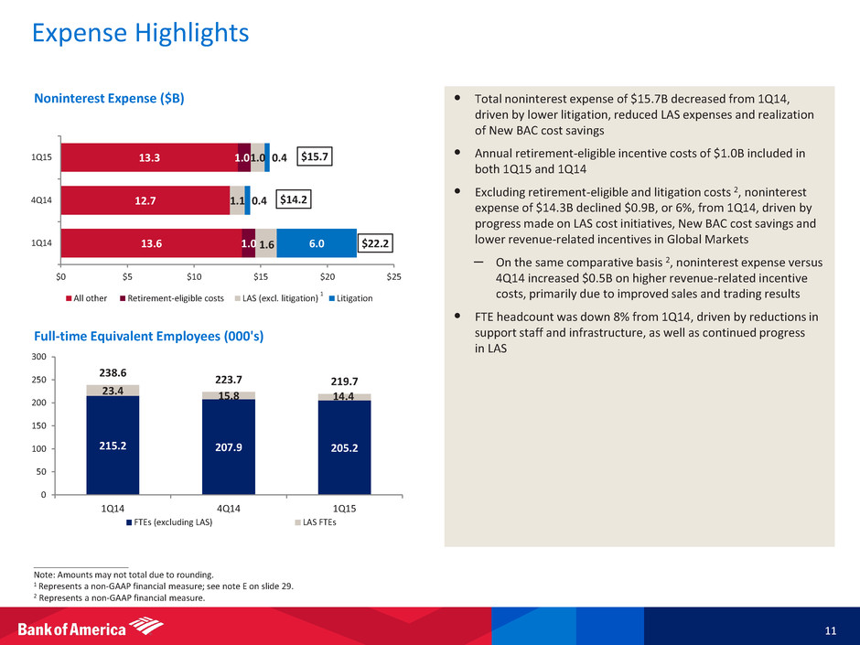 Net Interest Income 10 • Reported net interest income (NII) 1 of $9.7B, down $0.2B from 4Q14 • Negative market-related NII adjustments of $484MM in 1Q15 versus $578MM negative adjustments in 4Q14 • Excluding market-related adjustments, NII 1 of $10.2B declined from 4Q14, driven by two fewer interest accrual days and margin compression due to the continued low interest rate environment, partially offset by lower funding costs – Net interest yield declined to 2.28% • The asset sensitivity of the balance sheet increased from prior quarter due to the lower rate environment; we remain well positioned for NII to benefit as rates move higher – +100 bps parallel shift in interest rate yield curve is estimated to benefit NII by $4.6B over the next 12 months ____________________ 1 FTE basis. Represents a non-GAAP financial measure; see note D on slide 29. Reported NII ($B) 1 NII Excluding Market-related Adjustments ($B) 1 $10.3 $10.2 $10.4 $9.9 $9.7 2.29% 2.22% 2.29% 2.18% 2.17% 0% 1% 2% 3% 4% $0 $2 $4 $6 $8 $10 $12 1Q14 2Q14 3Q14 4Q14 1Q15 Net interest income Net interest yield $10.6 $10.4 $10.5 $10.4 $10.2 2.36% 2.26% 2.30% 2.31% 2.28% 0% 1% 2% 3% 4% $0 $2 $4 $6 $8 $10 $12 1Q14 2Q14 3Q14 4Q14 1Q15 Net interest income Net interest yield