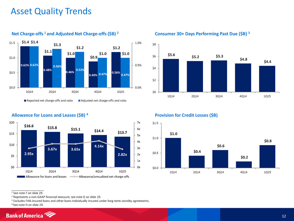 13.6 12.7 13.3 1.0 1.0 1.6 1.1 1.0 6.0 0.4 0.4 $22.2 $14.2 $15.7 $0 $5 $10 $15 $20 $25 1Q14 4Q14 1Q15 All other Retirement-eligible costs LAS (excl. litigation) Litigation Expense Highlights ____________________ Note: Amounts may not total due to rounding. 1 Represents a non-GAAP financial measure; see note E on slide 29. 2 Represents a non-GAAP financial measure. • Total noninterest expense of $15.7B decreased from 1Q14, driven by lower litigation, reduced LAS expenses and realization of New BAC cost savings • Annual retirement-eligible incentive costs of $1.0B included in both 1Q15 and 1Q14 • Excluding retirement-eligible and litigation costs 2, noninterest expense of $14.3B declined $0.9B, or 6%, from 1Q14, driven by progress made on LAS cost initiatives, New BAC cost savings and lower revenue-related incentives in Global Markets – On the same comparative basis 2, noninterest expense versus 4Q14 increased $0.5B on higher revenue-related incentive costs, primarily due to improved sales and trading results • FTE headcount was down 8% from 1Q14, driven by reductions in support staff and infrastructure, as well as continued progress in LAS Noninterest Expense ($B) Full-time Equivalent Employees (000's) 11 1 215.2 207.9 205.2 23.4 15.8 14.4 238.6 223.7 219.7 0 50 100 150 200 250 300 1Q14 4Q14 1Q15 FTEs (excluding LAS) LAS FTEs
