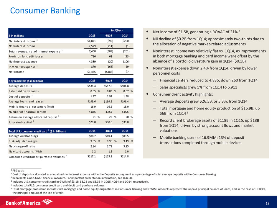 $16.6 $15.8 $15.1 $14.4 $13.7 2.95x 3.67x 3.65x 4.14x 2.82x 0x 1x 2x 3x 4x 5x 6x 7x $0 $5 $10 $15 $20 1Q14 2Q14 3Q14 4Q14 1Q15 T h o u s a n d s Allowance for loans and leases Allowance/annualized net charge-offs $1.4 $1.1 $1.0 $0.9 $1.2 $1.4 $1.3 $1.2 $1.0 $1.0 0.56% 0.52% 0.47% 0.47% 0.62% 0.48% 0.46% 0.40% 0.56% 0.0% 0.5% 1.0% $0.0 $0.5 $1.0 $1.5 1Q14 2Q14 3Q14 4Q14 1Q15 Reported net charge-offs and ratio Adjusted net charge-offs and ratio ____________________ 1 See note F on slide 29. 2 Represents a non-GAAP financial measure; see note G on slide 29. 3 Excludes FHA-insured loans and other loans individually insured under long-term standby agreements. 4 See note H on slide 29. Asset Quality Trends 12 Net Charge-offs 1 and Adjusted Net Charge-offs ($B) 2 Allowance for Loans and Leases ($B) 4 Provision for Credit Losses ($B) Consumer 30+ Days Performing Past Due ($B) 3 $1.0 $0.4 $0.6 $0.2 $0.8 $0.0 $0.5 $1.0 $1.5 1Q14 2Q14 3Q14 4Q14 1Q15 $5.6 $5.2 $5.3 $4.8 $4.4 $0 $2 $4 $6 $8 1Q14 2Q14 3Q14 4Q14 1Q15 0.62%
