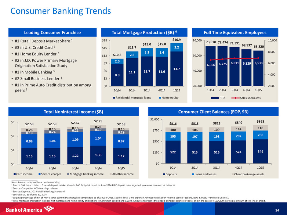 Consumer Banking 13 ____________________ 1 FTE basis. 2 Cost of deposits calculated as annualized noninterest expense within the Deposits subsegment as a percentage of total average deposits within Consumer Banking. 3 Represents a non-GAAP financial measure. For important presentation information, see slide 31. 4 Includes U.S. consumer credit card in GWIM of $3.1B. $3.2B and $3.3B in 1Q15, 4Q14 and 1Q14, respectively. 5 Includes total U.S. consumer credit card and debit card purchase volumes. 6 Total mortgage production includes first mortgage and home equity originations in Consumer Banking and GWIM. Amounts represent the unpaid principal balance of loans, and in the case of HELOCs, the principal amount of the line of credit. • [ Bullets to come ] • Net income of $1.5B, generating a ROAAC of 21% 3 NII decline of $0.2B from 1Q14; approximately two-thirds due to the allocation of negative market-related adjustments • Noninterest income was relatively flat vs. 1Q14, as improvements in both mortgage banking and card income were offset by the absence of a portfolio divestiture gain in 1Q14 ($0.1B) • Noninterest expense down 2.4% from 1Q14, driven by lower personnel costs – Financial centers reduced to 4,835, down 260 from 1Q14 – Sales specialists grew 5% from 1Q14 to 6,911 • Consumer client activity highlights: – Average deposits grew $26.5B, or 5.3%, from 1Q14 – Total mortgage and home equity production of $16.9B, up $6B from 1Q14 6 – Record client brokerage assets of $118B in 1Q15, up $18B from 1Q14, driven by strong account flows and market valuations – Mobile banking users of 16.9MM; 13% of deposit transactions completed through mobile devices $ in millions Net interest income 1 $4,871 ($95) ($200) Noninterest income 2,579 (214) (1) Total revenue, net of interest expense 1 7,450 (309) (201) Provis ion for credit losses 716 63 (93) Noninterest expense 4,389 (20) (106) Income tax expense 1 870 (166) (9) Net income $1,475 ($186) $7 Key Indicators ($ in billions) Average depos its $531.4 $517.6 $504.8 Rate paid on depos its 0.05 % 0.05 % 0.07 % Cost of depos its 2 1.87 1.91 1.98 Average loans and leases $199.6 $199.2 $196.4 Mobi le financia l customers (MM) 16.9 16.5 15.0 Number of financia l centers 4,835 4,855 5,095 Return on average a l located capita l 3 21 % 22 % 20 % Al located capita l 3 $29.0 $30.0 $30.0 Total U.S. consumer credit card 4 ($ in billions) Average outstandings $88.7 $89.4 $89.5 Risk-adjusted margin 9.05 % 9.96 % 9.49 % Net charge-off ratio 2.84 2.71 3.25 New card accounts (MM) 1.2 1.2 1.0 Combined credit/debit purchase volumes 5 $117.1 $125.1 $114.8 1Q15 4Q14 1Q14 Inc/(Dec) 1Q15 4Q14 1Q14 1Q15 4Q14 1Q14