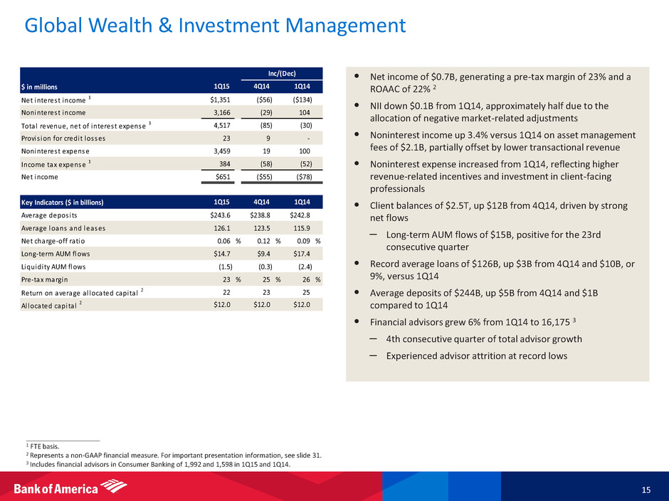 Consumer Banking Trends 14 • #1 Retail Deposit Market Share 1 • #3 in U.S. Credit Card 2 • #1 Home Equity Lender 2 • #2 in J.D. Power Primary Mortgage Origination Satisfaction Study • #1 in Mobile Banking 3 • #2 Small Business Lender 4 • #1 in Prime Auto Credit distribution among peers 5 Leading Consumer Franchise Full Time Equivalent Employees 73,018 72,474 71,391 68,537 66,820 6,566 6,725 6,871 6,829 6,911 2,000 4,000 6,000 8,000 10,000 20,000 40,000 60,000 80,000 1Q14 2Q14 3Q14 4Q14 1Q15 FTEs Sales specialists 1.15 1.15 1.22 1.33 1.17 0.99 1.04 1.09 1.04 0.97 0.18 0.24 0.21 0.19 0.29 0.26 0.16 0.16 0.23 0.16 $2.58 $2.59 $2.67 $2.79 $2.58 $0 $1 $2 $3 1Q14 2Q14 3Q14 4Q14 1Q15 Card income Service charges Mortgage banking income All other income Total Noninterest Income ($B) Total Mortgage Production ($B) 6 8.9 11.1 11.7 11.6 13.7 2.0 2.6 3.2 3.4 3.2 $10.8 $13.7 $15.0 $15.0 $16.9 $0 $3 $6 $9 $12 $15 $18 1Q14 2Q14 3Q14 4Q14 1Q15 Residential mortgage loans Home equity Consumer Client Balances (EOP, $B) 522 515 516 524 549 195 197 198 202 200 100 106 109 114 118 $816 $818 $823 $840 $868 $0 $250 $500 $750 $1,000 1Q14 2Q14 3Q14 4Q14 1Q15 Deposits Loans and leases Client brokerage assets ____________________ Note: Amounts may not total due to rounding. 1 Source: SNL branch data. U.S. retail deposit market share in BAC footprint based on June 2014 FDIC deposit data, adjusted to remove commercial balances. 2 Source: Competitor 4Q14 earnings releases. 3 Source: Keynote, 1Q15 Mobile Banking Scorecard. 4 Source: FDIC as of June 30, 2014. 5 Largest percentage of mix of 740+ Scorex customers among key competitors as of January 2015. Source: Total Units Experian Autocount Risk Loan Analysis Scorex + (Loans, New & Used, Franchised Dealers). 6 Total mortgage production includes first mortgage and home equity originations in Consumer Banking and GWIM. Amounts represent the unpaid principal balance of loans, and in the case of HELOCs, the principal amount of the line of credit.