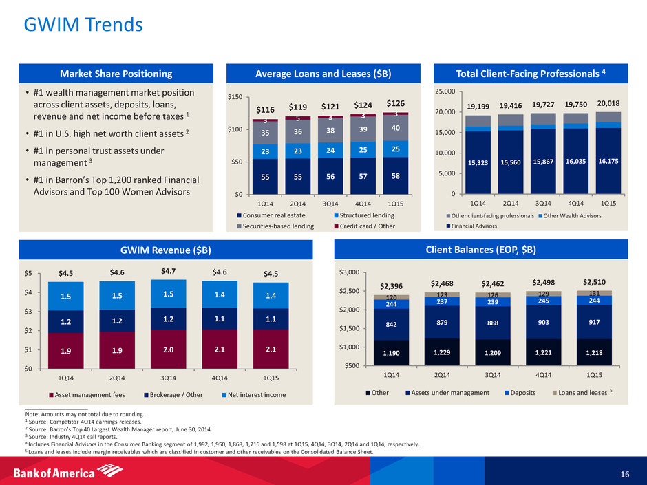 Global Wealth & Investment Management 15 ____________________ 1 FTE basis. 2 Represents a non-GAAP financial measure. For important presentation information, see slide 31. 3 Includes financial advisors in Consumer Banking of 1,992 and 1,598 in 1Q15 and 1Q14. • Net income of $0.7B, generating a pre-tax margin of 23% and a ROAAC of 22% 2 • NII down $0.1B from 1Q14, approximately half due to the allocation of negative market-related adjustments • Noninterest income up 3.4% versus 1Q14 on asset management fees of $2.1B, partially offset by lower transactional revenue • Noninterest expense increased from 1Q14, reflecting higher revenue-related incentives and investment in client-facing professionals • Client balances of $2.5T, up $12B from 4Q14, driven by strong net flows – Long-term AUM flows of $15B, positive for the 23rd consecutive quarter • Record average loans of $126B, up $3B from 4Q14 and $10B, or 9%, versus 1Q14 • Average deposits of $244B, up $5B from 4Q14 and $1B compared to 1Q14 • Financial advisors grew 6% from 1Q14 to 16,175 3 – 4th consecutive quarter of total advisor growth – Experienced advisor attrition at record lows $ in millions Net interest income 1 $1,351 ($56) ($134) Noninterest income 3,166 (29) 104 Total revenue, net of interest expense 1 4,517 (85) (30) Provis ion for credit losses 23 9 - Noninterest expense 3,459 19 100 Income tax expense 1 384 (58) (52) Net income $651 ($55) ($78) Key Indicators ($ in billions) Average depos its $243.6 $238.8 $242.8 Average loans and leases 126.1 123.5 115.9 Net charge-off ratio 0.06 % 0.12 % 0.09 % Long-term AUM flows $14.7 $9.4 $17.4 Liquidi ty AUM flows (1.5) (0.3) (2.4) Pre-tax margin 23 % 25 % 26 % Return on average a l located capita l 2 22 23 25 Al located capita l 2 $12.0 $12.0 $12.0 Inc/(Dec) 1Q15 4Q14 1Q14 1Q15 4Q14 1Q14