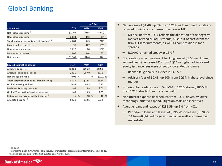 GWIM Trends 16 Market Share Positioning Average Loans and Leases ($B) Total Client-Facing Professionals 4 15,323 15,560 15,867 16,035 16,175 19,199 19,416 19,727 19,750 20,018 0 5,000 10,000 15,000 20,000 25,000 1Q14 2Q14 3Q14 4Q14 1Q15 Other client-facing professionals Other Wealth Advisors Financial Advisors • #1 wealth management market position across client assets, deposits, loans, revenue and net income before taxes 1 • #1 in U.S. high net worth client assets 2 • #1 in personal trust assets under management 3 • #1 in Barron’s Top 1,200 ranked Financial Advisors and Top 100 Women Advisors 1,190 1,229 1,209 1,221 1,218 842 879 888 903 917 244 237 239 245 244 120 123 126 129 131 $2,396 $2,468 $2,462 $2,498 $2,510 $500 $1,000 $1,500 $2,000 $2,500 $3,000 1Q14 2Q14 3Q14 4Q14 1Q15 Other Assets under management Deposits Loans and leases Client Balances (EOP, $B) 55 55 56 57 58 23 23 24 25 25 35 36 38 39 40 3 5 3 3 3 $116 $119 $121 $124 $126 $0 $50 $100 $150 1Q14 2Q14 3Q14 4Q14 1Q15 Consumer real estate Structured lending Securities-based lending Credit card / Other ____________________ Note: Amounts may not total due to rounding. 1 Source: Competitor 4Q14 earnings releases. 2 Source: Barron’s Top 40 Largest Wealth Manager report, June 30, 2014. 3 Source: Industry 4Q14 call reports. 4 Includes Financial Advisors in the Consumer Banking segment of 1,992, 1,950, 1,868, 1,716 and 1,598 at 1Q15, 4Q14, 3Q14, 2Q14 and 1Q14, respectively. 5 Loans and leases include margin receivables which are classified in customer and other receivables on the Consolidated Balance Sheet. GWIM Revenue ($B) 1.9 1.9 2.0 2.1 2.1 1.2 1.2 1.2 1.1 1.1 1.5 1.5 1.5 1.4 1.4 $4.5 $4.6 $4.7 $4.6 $4.5 $0 $1 $2 $3 $4 $5 1Q14 2Q14 3Q14 4Q14 1Q15 Asset management fees Brokerage / Other Net interest income 5