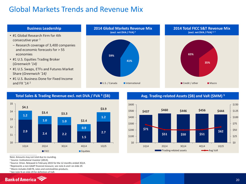 Global Markets 19 • [ Bullets to come ] ____________________ 1 FTE basis. 2 Represents a non-GAAP financial measure; see note A on slide 29. 3 In addition to sales and trading revenue, Global Markets shares with Global Banking in certain deal economics from investment banking and loan origination activities. 4 Represents a non-GAAP financial measure. For important presentation information, see slide 31. n/m = not meaningful • Net income of $0.9B in 1Q15 declined from 1Q14, due primarily to lower sales and trading results in FICC – Generated a ROAAC of 11% 4 • Excluding net DVA / FVA 2, sales and trading revenue of $3.9B declined $0.2B, or 5%, from 1Q14 – FICC revenue declined $0.2B, or 7%, from 1Q14, reflecting business mix weighting towards spread products, primarily credit and mortgages, which experienced lower client activity; decline was partially offset by post-merger record FX results due to increased market volatility – Equities revenue was stable versus 1Q14 • Noninterest expense increased modestly from 1Q14 as a reduction in revenue-related incentive compensation was offset by $260MM increase in litigation expense – Excluding litigation, expense declined 7% versus 1Q14 $ in millions Net interest income 1 $1,004 ($28) $2 Noninterest income (excl . net DVA / FVA) 2, 3 3,580 1,616 (323) Total revenue (excl . net DVA / FVA) 1, 2, 3 4,584 1,588 (321) Net DVA / FVA 19 645 (93) Total revenue, net of interest expense 1, 3 4,603 2,233 (414) Provis ion for credit losses 21 (5) 2 Noninterest expense 3,120 620 45 Income tax expense 1 517 601 (93) Net income $945 $1,017 ($368) Key Indicators ($ in billions) Average trading-related assets $444.0 $455.5 $437.1 Average loans and leases 57.0 58.1 63.7 Sales and trading rev nue 3.9 1.7 4.2 Sales and trading reven e (excl . net DVA / FVA) 2 3.9 2.4 4.1 Global Markets IB fees 3 0.6 0.7 0.7 Return on average a l located capita l 4 11 % n/m 16 % Al located capita l 4 $35.0 $34.0 $34.0 Inc/(Dec) 1Q15 4Q14 1Q14 1Q15 4Q14 1Q14