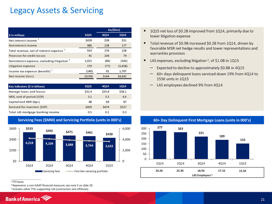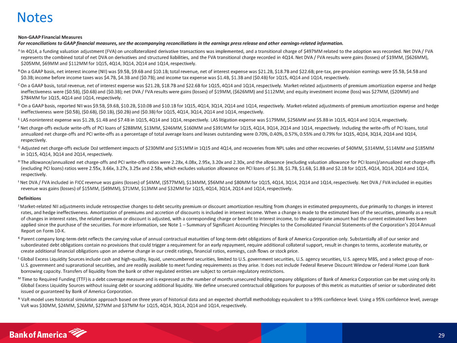 Notes 29 Non-GAAP Financial Measures For reconciliations to GAAP financial measures, see the accompanying reconciliations in the earnings press release and other earnings-related information. A In 4Q14, a funding valuation adjustment (FVA) on uncollateralized derivative transactions was implemented, and a transitional charge of $497MM related to the adoption was recorded. Net DVA / FVA represents the combined total of net DVA on derivatives and structured liabilities, and the FVA transitional charge recorded in 4Q14. Net DVA / FVA results were gains (losses) of $19MM, ($626MM), $205MM, $69MM and $112MM for 1Q15, 4Q14, 3Q14, 2Q14 and 1Q14, respectively. B On a GAAP basis, net interest income (NII) was $9.5B, $9.6B and $10.1B; total revenue, net of interest expense was $21.2B, $18.7B and $22.6B; pre-tax, pre-provision earnings were $5.5B, $4.5B and $0.3B; income before income taxes was $4.7B, $4.3B and ($0.7B); and income tax expense was $1.4B, $1.3B and ($0.4B) for 1Q15, 4Q14 and 1Q14, respectively. C On a GAAP basis, total revenue, net of interest expense was $21.2B, $18.7B and $22.6B for 1Q15, 4Q14 and 1Q14, respectively. Market-related adjustments of premium amortization expense and hedge ineffectiveness were ($0.5B), ($0.6B) and ($0.3B); net DVA / FVA results were gains (losses) of $19MM, ($626MM) and $112MM; and equity investment income (loss) was $27MM, ($20MM) and $784MM for 1Q15, 4Q14 and 1Q14, respectively. D On a GAAP basis, reported NII was $9.5B, $9.6B, $10.2B, $10.0B and $10.1B for 1Q15, 4Q14, 3Q14, 2Q14 and 1Q14, respectively. Market-related adjustments of premium amortization expense and hedge ineffectiveness were ($0.5B), ($0.6B), ($0.1B), ($0.2B) and ($0.3B) for 1Q15, 4Q14, 3Q14, 2Q14 and 1Q14, respectively. E LAS noninterest expense was $1.2B, $1.4B and $7.4B in 1Q15, 4Q14 and 1Q14, respectively. LAS litigation expense was $179MM, $256MM and $5.8B in 1Q15, 4Q14 and 1Q14, respectively. F Net charge-offs exclude write-offs of PCI loans of $288MM, $13MM, $246MM, $160MM and $391MM for 1Q15, 4Q14, 3Q14, 2Q14 and 1Q14, respectively. Including the write-offs of PCI loans, total annualized net charge-offs and PCI write-offs as a percentage of total average loans and leases outstanding were 0.70%, 0.40%, 0.57%, 0.55% and 0.79% for 1Q15, 4Q14, 3Q14, 2Q14 and 1Q14, respectively. G Adjusted net charge-offs exclude DoJ settlement impacts of $230MM and $151MM in 1Q15 and 4Q14, and recoveries from NPL sales and other recoveries of $40MM, $314MM, $114MM and $185MM in 1Q15, 4Q14, 3Q14 and 2Q14, respectively. H The allowance/annualized net charge-offs and PCI write-offs ratios were 2.28x, 4.08x, 2.95x, 3.20x and 2.30x, and the allowance (excluding valuation allowance for PCI loans)/annualized net charge-offs (excluding PCI loans) ratios were 2.55x, 3.66x, 3.27x, 3.25x and 2.58x, which excludes valuation allowance on PCI loans of $1.3B, $1.7B, $1.6B, $1.8B and $2.1B for 1Q15, 4Q14, 3Q14, 2Q14 and 1Q14, respectively. I Net DVA / FVA included in FICC revenue was gains (losses) of $4MM, ($577MM), $134MM, $56MM and $80MM for 1Q15, 4Q14, 3Q14, 2Q14 and 1Q14, respectively. Net DVA / FVA included in equities revenue was gains (losses) of $15MM, ($49MM), $71MM, $13MM and $32MM for 1Q15, 4Q14, 3Q14, 2Q14 and 1Q14, respectively. Definitions J Market-related NII adjustments include retrospective changes to debt security premium or discount amortization resulting from changes in estimated prepayments, due primarily to changes in interest rates, and hedge ineffectiveness. Amortization of premiums and accretion of discounts is included in interest income. When a change is made to the estimated lives of the securities, primarily as a result of changes in interest rates, the related premium or discount is adjusted, with a corresponding charge or benefit to interest income, to the appropriate amount had the current estimated lives been applied since the purchase of the securities. For more information, see Note 1 – Summary of Significant Accounting Principles to the Consolidated Financial Statements of the Corporation’s 2014 Annual Report on Form 10-K. K Parent company long-term debt reflects the carrying value of annual contractual maturities of long-term debt obligations of Bank of America Corporation only. Substantially all of our senior and subordinated debt obligations contain no provisions that could trigger a requirement for an early repayment, require additional collateral support, result in changes to terms, accelerate maturity, or create additional financial obligations upon an adverse change in our credit ratings, financial ratios, earnings, cash flows or stock price. L Global Excess Liquidity Sources include cash and high-quality, liquid, unencumbered securities, limited to U.S. government securities, U.S. agency securities, U.S. agency MBS, and a select group of non- U.S. government and supranational securities, and are readily available to meet funding requirements as they arise. It does not include Federal Reserve Discount Window or Federal Home Loan Bank borrowing capacity. Transfers of liquidity from the bank or other regulated entities are subject to certain regulatory restrictions. M Time to Required Funding (TTF) is a debt coverage measure and is expressed as the number of months unsecured holding company obligations of Bank of America Corporation can be met using only its Global Excess Liquidity Sources without issuing debt or sourcing additional liquidity. We define unsecured contractual obligations for purposes of this metric as maturities of senior or subordinated debt issued or guaranteed by Bank of America Corporation. N VaR model uses historical simulation approach based on three years of historical data and an expected shortfall methodology equivalent to a 99% confidence level. Using a 95% confidence level, average VaR was $30MM, $24MM, $26MM, $27MM and $37MM for 1Q15, 4Q14, 3Q14, 2Q14 and 1Q14, respectively.