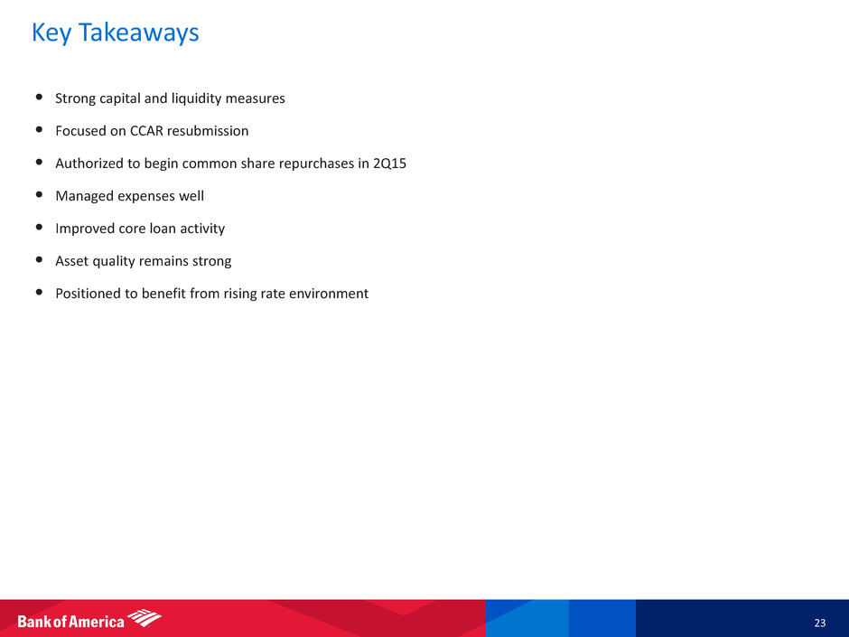 • Total revenue declined $0.7B from 1Q14 – Net interest income decline of $0.1B was due primarily to lower NII from liquidating businesses – Noninterest income decline of $0.6B was driven by lower equity investment income ($0.7B) • Provision benefit increased $47MM from 1Q14, driven primarily by recoveries on the sale of nonperforming loans • Noninterest expense decreased $0.2B from 1Q14, driven by lower litigation expense – Annual retirement-eligible incentive costs recorded in 1Q15 and 1Q14; allocated to the businesses throughout the year ____________________ 1 All Other consists of ALM activities, equity investments, the international consumer card business, liquidating businesses, residual expense allocations and other. ALM activities encompass the whole- loan residential mortgage portfolio and investment securities, interest rate and foreign currency risk management activities including the residual net interest income allocation, the impact of certain allocation methodologies and accounting hedge ineffectiveness. Additionally, All Other includes certain residential mortgage loans that are managed by Legacy Assets & Servicing. The results of certain ALM activities are allocated to our business segments. Equity investments include Global Principal Investments which is comprised of a portfolio of equity, real estate and other alternative investments. These investments are made either directly in a company or held through a fund with related income recorded in equity investment income. Equity investments also include the results of our merchant services joint venture. 2 FTE basis. 3 In the U.K., we previously sold payment protection insurance through our international card services business to credit card and consumer loan customers. 22 All Other 1 $ in millions Net interest income 2 ($249) $101 ($93) Noninterest income (103) 293 (590) Total revenue, net of interest expense 2 (352) 394 (683) Provis ion for credit losses (182) 148 (47) Noninterest expense 1,504 1,023 (214) Income tax expense (benefi t) 2 (833) (310) 222 Net income (loss ) ($841) ($467) ($644) Selected Revenue Items ($ in millions) Equity investment income (loss ) $1 ($36) $696 Gains on sa les of debt securi ties 263 161 357 U.K. payment protection insurance provis ion 3 - (139) (141) Key Indicators ($ in billions) Average loans and leases $167.8 $183.1 $217.4 Book va lue of Global Principal Investments 0.8 0.9 1.3 Total BAC equity investment exposure 11.4 11.7 12.0 Inc/(Dec) 4Q14 1Q14 1Q15 4Q14 1Q14 1Q15 1Q15 4Q14 1Q14