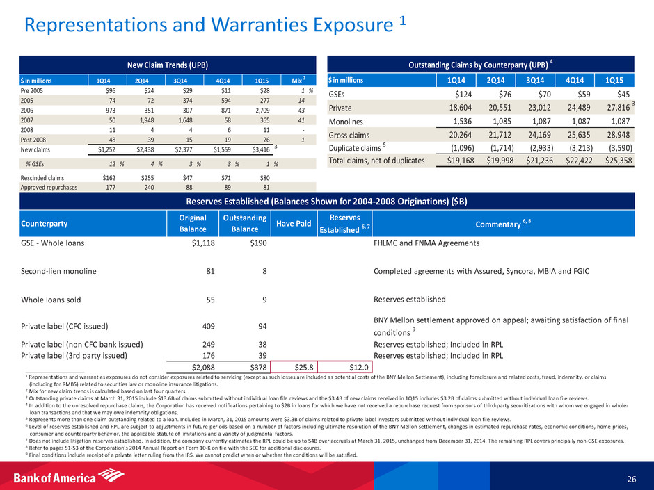 Representations and Warranties Exposure 1 26 ____________________ 1 Representations and warranties exposures do not consider exposures related to servicing (except as such losses are included as potential costs of the BNY Mellon Settlement), including foreclosure and related costs, fraud, indemnity, or claims (including for RMBS) related to securities law or monoline insurance litigations. 2 Mix for new claim trends is calculated based on last four quarters. 3 Outstanding private claims at March 31, 2015 include $13.6B of claims submitted without individual loan file reviews and the $3.4B of new claims received in 1Q15 includes $3.2B of claims submitted without individual loan file reviews. 4 In addition to the unresolved repurchase claims, the Corporation has received notifications pertaining to $2B in loans for which we have not received a repurchase request from sponsors of third-party securitizations with whom we engaged in whole- loan transactions and that we may owe indemnity obligations. 5 Represents more than one claim outstanding related to a loan. Included in March, 31, 2015 amounts were $3.3B of claims related to private label investors submitted without individual loan file reviews. 6 Level of reserves established and RPL are subject to adjustments in future periods based on a number of factors including ultimate resolution of the BNY Mellon settlement, changes in estimated repurchase rates, economic conditions, home prices, consumer and counterparty behavior, the applicable statute of limitations and a variety of judgmental factors. 7 Does not include litigation reserves established. In addition, the company currently estimates the RPL could be up to $4B over accruals at March 31, 2015, unchanged from December 31, 2014. The remaining RPL covers principally non-GSE exposures. 8 Refer to pages 51-53 of the Corporation’s 2014 Annual Report on Form 10-K on file with the SEC for additional disclosures. 9 Final conditions include receipt of a private letter ruling from the IRS. We cannot predict when or whether the conditions will be satisfied. $ in millions 1Q14 2Q14 3Q14 4Q14 1Q15 GSEs $124 $76 $70 $59 $45 Private 18,604 20,551 23,012 24,489 27,816 Monolines 1,536 1,085 1,087 1,087 1,087 Gross claims 20,264 21,712 24,169 25,635 28,948 Duplicate claims 5 (1,096) (1,714) (2,933) (3,213) (3,590) Total claims, net of duplicates $19,168 $19,998 $21,236 $22,422 $25,358 Outstanding Claims by Counterparty (UPB) 4 $ in millions 1Q14 2Q14 3Q14 Pre 2005 $96 $24 $29 $11 $28 1 % 2005 74 72 374 594 277 14 2006 973 351 307 871 2,709 43 2007 50 1,948 1,648 58 365 41 2008 11 4 4 6 11 - Post 2008 48 39 15 19 26 1 New claims $1,252 $2,438 $2,377 $1,559 $3,416 % GSEs 12 % 4 % 3 % 3 % 1 % Rescinded claims $162 $255 $47 $71 $80 Approved repurchases 177 240 88 89 81 New Claim Trends (UPB) Mix 2 4Q14 1Q15 Counterparty Original Balance Outstanding Balance Have Paid Reserves Established 6, 7 Commentary 6, 8 GSE - Whole loans $1,118 $190 FHLMC and FNMA Agreements Second-lien monoline 81 8 Completed agreements with Assured, Syncora, MBIA and FGIC Whole loans sold 55 9 Reserves established Private label (CFC issued) 409 94 BNY Mellon settlement approved on appeal; awaiting satisfaction of final conditions 9 Private l b l (non CFC bank issued) 249 38 Reserves established; Included in RPL Pri ate label (3rd party issued) 176 39 Reserves established; Included in RPL $2,088 $378 $25.8 $12.0 Reserves Established (Balances Shown for 2004-2008 Originations) ($B) 3 3