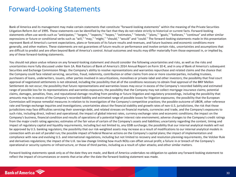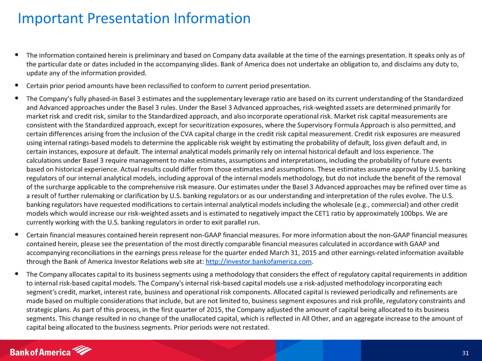 Forward-Looking Statements 30 Bank of America and its management may make certain statements that constitute “forward-looking statements” within the meaning of the Private Securities Litigation Reform Act of 1995. These statements can be identified by the fact that they do not relate strictly to historical or current facts. Forward-looking statements often use words such as “anticipates,” “targets,” “expects,” “hopes,” “estimates,” “intends,” “plans,” “goals,” “believes,” “continue” and other similar expressions or future or conditional verbs such as “will,” “may,” “might,” “should,” “would” and “could.” The forward-looking statements made in this presentation represent Bank of America's current expectations, plans or forecasts of its future results and revenues, and future business and economic conditions more generally, and other matters. These statements are not guarantees of future results or performance and involve certain risks, uncertainties and assumptions that are difficult to predict and are often beyond Bank of America’s control. Actual outcomes and results may differ materially from those expressed in, or implied by, any of these forward-looking statements. You should not place undue reliance on any forward-looking statement and should consider the following uncertainties and risks, as well as the risks and uncertainties more fully discussed under Item 1A. Risk Factors of Bank of America's 2014 Annual Report on Form 10-K, and in any of Bank of America's subsequent Securities and Exchange Commission filings: the Company's ability to resolve representations and warranties repurchase and related claims and the chance that the Company could face related servicing, securities, fraud, indemnity, contribution or other claims from one or more counterparties, including trustees, purchasers of loans, underwriters, issuers, other parties involved in securitizations, monolines or private-label and other investors; the possibility that final court approval of negotiated settlements is not obtained, including the possibility that all of the conditions necessary to obtain final approval of the BNY Mellon Settlement do not occur; the possibility that future representations and warranties losses may occur in excess of the Company's recorded liability and estimated range of possible loss for its representations and warranties exposures; the possibility that the Company may not collect mortgage insurance claims; potential claims, damages, penalties, fines, and reputational damage resulting from pending or future litigation and regulatory proceedings, including the possibility that amounts may be in excess of the Company’s recorded liability and estimated range of possible losses for litigation exposures; the possibility that the European Commission will impose remedial measures in relation to its investigation of the Company's competitive practices; the possible outcome of LIBOR, other reference rate and foreign exchange inquiries and investigations; uncertainties about the financial stability and growth rates of non-U.S. jurisdictions, the risk that those jurisdictions may face difficulties servicing their sovereign debt, and related stresses on financial markets, currencies and trade, and the Company's exposures to such risks, including direct, indirect and operational; the impact of global interest rates, currency exchange rates and economic conditions; the impact on the Company's business, financial condition and results of operations of a potential higher interest rate environment; adverse changes to the Company's credit ratings from the major credit rating agencies; estimates of the fair value of certain of the Company's assets and liabilities; uncertainty regarding the content, timing and impact of regulatory capital and liquidity requirements, including but not limited to, any GSIB surcharge; the possibility that our internal analytical models will not be approved by U.S. banking regulators; the possibility that our risk-weighted assets may increase as a result of modifications to our internal analytical models in connection with an exit of parallel run; the possible impact of Federal Reserve actions on the Company’s capital plans; the impact of implementation and compliance with new and evolving U.S. and international regulations, including but not limited to recovery and resolution planning requirements, the Volcker Rule and derivatives regulations; the impact of the U.K. tax law change limiting how much NOLs can offset annual profit; a failure in or breach of the Company’s operational or security systems or infrastructure, or those of third parties, including as a result of cyber attacks; and other similar matters. Forward-looking statements speak only as of the date they are made, and Bank of America undertakes no obligation to update any forward-looking statement to reflect the impact of circumstances or events that arise after the date the forward-looking statement was made.
