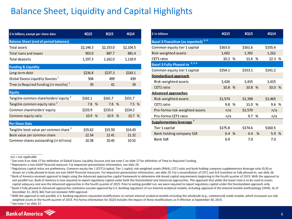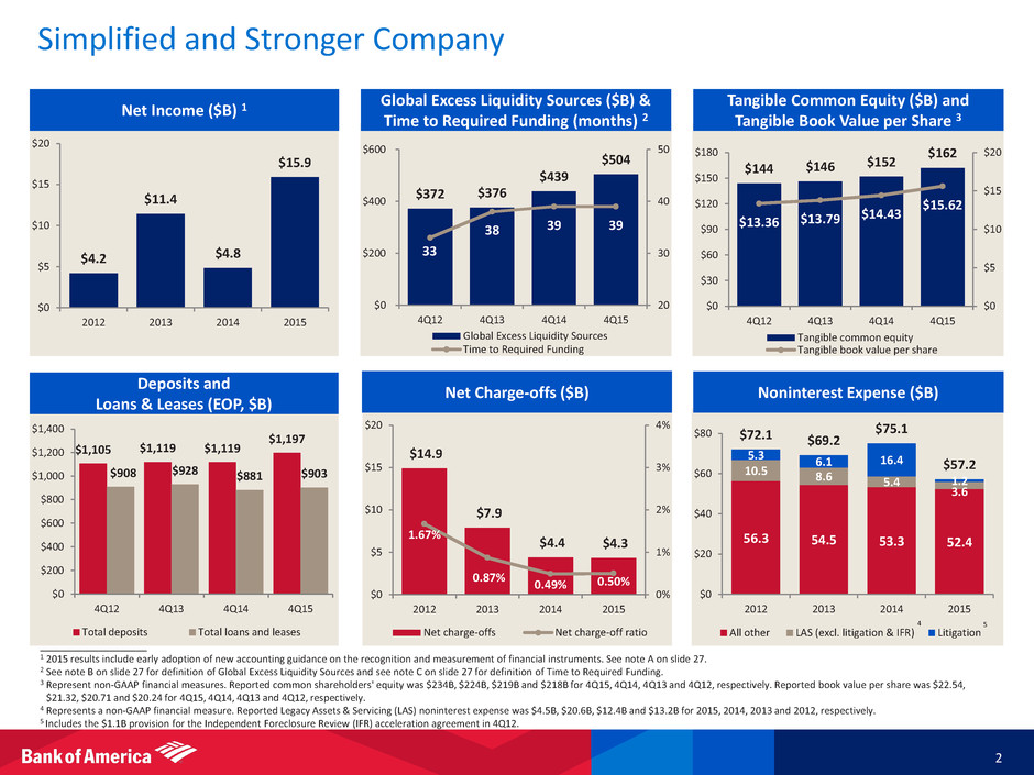 Simplified and Stronger Company $144 $146 $152 $162 $13.36 $13.79 $14.43 $15.62 $0 $5 $10 $15 $20 $0 $30 $60 $90 $120 $150 $180 4Q12 4Q13 4Q14 4Q15 Tangible common equity Tangible book value per share $372 $376 $439 $504 33 38 39 39 20 30 40 50 $0 $200 $400 $600 4Q12 4Q13 4Q14 4Q15 Global Excess Liquidity Sources Time to Required Funding Global Excess Liquidity Sources ($B) & Time to Required Funding (months) 2 Tangible Common Equity ($B) and Tangible Book Value per Share 3 2 $1,105 $1,119 $1,119 $1,197 $908 $928 $881 $903 $0 $200 $400 $600 $800 $1,000 $1,200 $1,400 4Q12 4Q13 4Q14 4Q15 Total deposits Total loans and leases Deposits and Loans & Leases (EOP, $B) ____________________ 1 2015 results include early adoption of new accounting guidance on the recognition and measurement of financial instruments. See note A on slide 27. 2 See note B on slide 27 for definition of Global Excess Liquidity Sources and see note C on slide 27 for definition of Time to Required Funding. 3 Represent non-GAAP financial measures. Reported common shareholders' equity was $234B, $224B, $219B and $218B for 4Q15, 4Q14, 4Q13 and 4Q12, respectively. Reported book value per share was $22.54, $21.32, $20.71 and $20.24 for 4Q15, 4Q14, 4Q13 and 4Q12, respectively. 4 Represents a non-GAAP financial measure. Reported Legacy Assets & Servicing (LAS) noninterest expense was $4.5B, $20.6B, $12.4B and $13.2B for 2015, 2014, 2013 and 2012, respectively. 5 Includes the $1.1B provision for the Independent Foreclosure Review (IFR) acceleration agreement in 4Q12. $14.9 $7.9 $4.4 $4.3 1.67% 0.87% 0.49% 0.50% 0% 1% 2% 3% 4% $0 $5 $10 $15 $20 2012 2013 2014 2015 Net charge-offs Net charge-off ratio Net Charge-offs ($B) $4.2 $11.4 $4.8 $15.9 $0 $5 $10 $15 $20 2012 2013 2014 2015 Net Income ($B) 1 56.3 54.5 53.3 52.4 10.5 8.6 5.4 3.6 5.3 6.1 16.4 1.2 $72.1 $69.2 $75.1 $57.2 $0 $20 $40 $60 $80 2012 2013 2014 2015 All other LAS (excl. litigation & IFR) Litigation Noninterest Expense ($B) 4 5