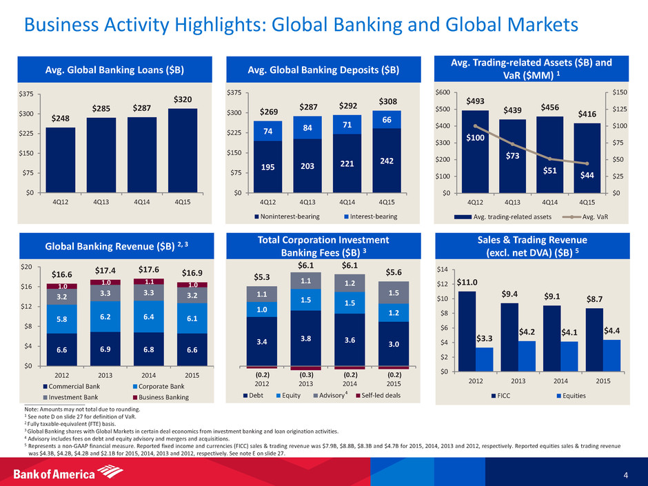 Business Activity Highlights: Consumer and Wealth Management 3 $21.5 $11.6 $11.6 $13.5 $1.0 $1.9 $3.4 $3.5 $0 $5 $10 $15 $20 $25 4Q12 4Q13 4Q14 4Q15 Residential mortgage loans Home equity $455 $498 $518 $557 $250 $240 $239 $251 $704 $738 $756 $809 $0 $300 $600 $900 4Q12 4Q13 4Q14 4Q15 Consumer Banking GWIM $2,152 $2,366 $2,498 $2,457 20.4 19.2 19.8 20.6 10 15 20 25 $0 $500 $1,000 $1,500 $2,000 $2,500 $3,000 4Q12 4Q13 4Q14 4Q15 Client balances Client-facing professionals 3 Avg. Consumer Deposits ($B) Total Mortgage and Home Equity Production ($B) 1 GWIM Client Balances ($B) and Client- Facing Professionals (000’s) $76 $96 $114 $123 $0 $20 $40 $60 $80 $100 $120 $140 4Q12 4Q13 4Q14 4Q15 Merrill Edge Brokerage Assets ($B) 12.0 14.4 16.5 18.7 4% 9% 12% 15% 0% 5% 10% 15% 20% 0 5 10 15 20 4Q12 4Q13 4Q14 4Q15 Mobile banking active users Mobile % of total deposit transactions Mobile Banking Active Users (MM) 2 5,478 5,151 4,855 4,726 3,000 4,000 5,000 6,000 4Q12 4Q13 4Q14 4Q15 ____________________ Note: Amounts may not total due to rounding. 1 Total mortgage production includes first mortgage and home equity originations in Consumer Banking and Global Wealth & Investment Management (GWIM). Amounts represent the unpaid principal balance of loans and in the case of home equity, the principal amount of the total line of credit. 2 Beginning in 1Q15, includes approximately 150,000 Merrill Edge and MyMerrill users. 3 Includes financial advisors in Consumer Banking of 2,191, 1,950, 1,545 and 1,497 at 4Q15, 4Q14, 4Q13 and 4Q12, respectively. Financial Centers