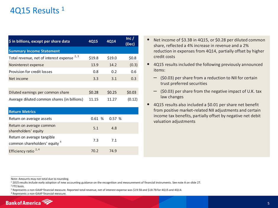 Business Activity Highlights: Global Banking and Global Markets 4 ____________________ Note: Amounts may not total due to rounding. 1 See note D on slide 27 for definition of VaR. 2 Fully taxable-equivalent (FTE) basis. 3 Global Banking shares with Global Markets in certain deal economics from investment banking and loan origination activities. 4 Advisory includes fees on debt and equity advisory and mergers and acquisitions. 5 Represents a non-GAAP financial measure. Reported fixed income and currencies (FICC) sales & trading revenue was $7.9B, $8.8B, $8.3B and $4.7B for 2015, 2014, 2013 and 2012, respectively. Reported equities sales & trading revenue was $4.3B, $4.2B, $4.2B and $2.1B for 2015, 2014, 2013 and 2012, respectively. See note E on slide 27. $11.0 $9.4 $9.1 $8.7 $3.3 $4.2 $4.1 $4.4 $0 $2 $4 $6 $8 $10 $12 $14 2012 2013 2014 2015 FICC Equities 195 203 221 242 74 84 71 66 $269 $287 $292 $308 $0 $75 $150 $225 $300 $375 4Q12 4Q13 4Q14 4Q15 Noninterest-bearing Interest-bearing $493 $439 $456 $416 $100 $73 $51 $44 $0 $25 $50 $75 $100 $125 $150 $0 $100 $200 $300 $400 $500 $600 4Q12 4Q13 4Q14 4Q15 Avg. trading-related assets Avg. VaR $248 $285 $287 $320 $0 $75 $150 $225 $300 $375 4Q12 4Q13 4Q14 4Q15 Avg. Global Banking Loans ($B) Avg. Global Banking Deposits ($B) Avg. Trading-related Assets ($B) and VaR ($MM) 1 3.4 3.8 3.6 3.0 1.0 1.5 1.5 1.2 1.1 1.1 1.2 1.5 (0.2) (0.3) (0.2) (0.2) $5.3 $6.1 $6.1 $5.6 2012 2013 2014 2015 Debt Equity Advisory Self-led deals4 6.6 6.9 6.8 6.6 5.8 6.2 6.4 6.1 3.2 3.3 3.3 3.2 1.0 1.0 1.1 1.0 $16.6 $17.4 $17.6 $16.9 $0 $4 $8 $12 $16 $20 2012 2013 2014 2015 Commercial Bank Corporate Bank Investment Bank Business Banking Global Banking Revenue ($B) 2, 3 Total Corporation Investment Banking Fees ($B) 3 Sales & Trading Revenue (excl. net DVA) ($B) 5