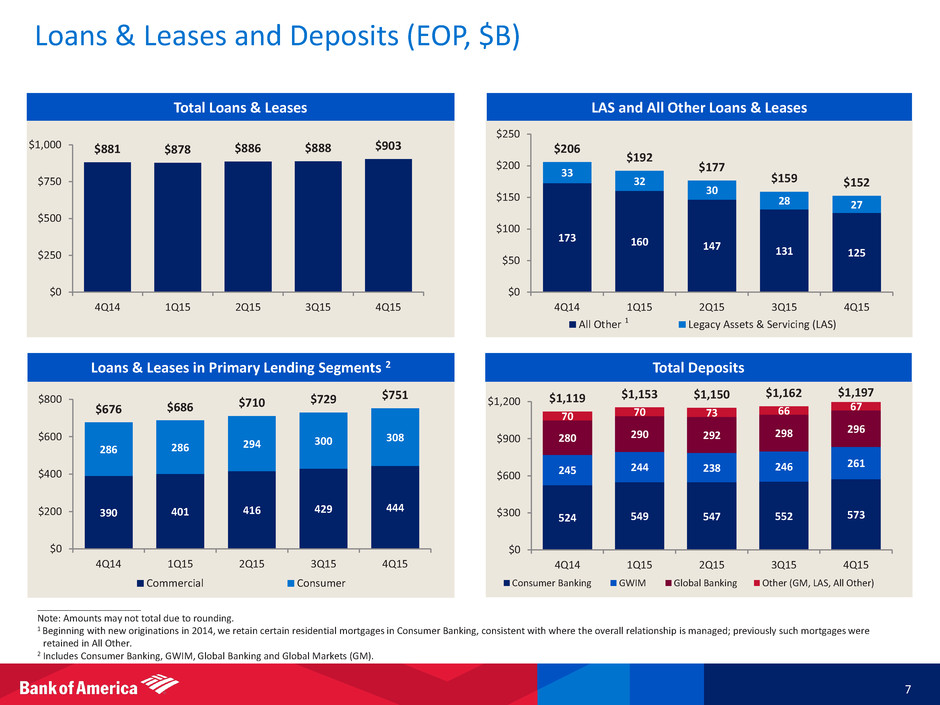 Balance Sheet, Liquidity and Capital Highlights 6 $ in billions, except per share data Balance Sheet (end of period balances) Total assets $2,144.3 $2,153.0 $2,104.5 Total loans and leases 903.0 887.7 881.4 Total deposits 1,197.3 1,162.0 1,118.9 Funding & Liquidity Long-term debt $236.8 $237.3 $243.1 Global Excess Liquidity Sources 1 504 499 439 Time to Required Funding (in months) 1 39 42 39 Equity Tangible common shareholders' equity 2 $162.1 $161.7 $151.7 Tangible common equity ratio 2 7.8 % 7.8 % 7.5 % Common shareholders' equity $233.9 $233.6 $224.2 Common equity ratio 10.9 % 10.9 % 10.7 % Per Share Data Tangible book value per common share 2 $15.62 $15.50 $14.43 Book value per common share 22.54 22.41 21.32 Common shares outstanding (in billions) 10.38 10.43 10.52 4Q15 3Q15 4Q14 ____________________ n/a = not applicable 1 See note B on slide 27 for definition of Global Excess Liquidity Sources and see note C on slide 27 for definition of Time to Required Funding. 2 Represents a non-GAAP financial measure. For important presentation information, see slide 29. 3 Regulatory capital ratios are preliminary. Common equity tier 1 (CET1) capital, Tier 1 capital, risk-weighted assets (RWA), CET1 ratio and bank holding company supplementary leverage ratio (SLR) as shown on a fully phased-in basis are non-GAAP financial measures. For important presentation information, see slide 29. For a reconciliation of CET1 and SLR transition to fully phased-in, see slide 26. 4 Bank of America received approval to begin using the Advanced approaches capital framework to determine risk-based capital requirements beginning in the fourth quarter of 2015. With the approval to exit parallel run, Bank of America is now required to report regulatory capital under both the Standardized and Advanced approaches. The approach that yields the lower ratio is to be used to assess capital adequacy and was the Advanced approaches in the fourth quarter of 2015. Prior to exiting parallel run, we were required to report regulatory capital under the Standardized approach only. 5 Basel 3 fully phased-in Advanced approaches estimates assume approval by U.S. banking regulators of our internal analytical models, including approval of the internal models methodology (IMM). As of December 31, 2015, BAC had not received IMM approval. 6 With the approval to exit parallel, U.S. banking regulators requested modifications to certain internal analytical models including the wholesale (e.g., commercial) credit models, which increased our risk- weighted assets in the fourth quarter of 2015. Pro-forma information for 3Q15 includes the impact of these modifications as if effective at September 30, 2015. 7 See note F on slide 27. $ in billions Basel 3 Transition (as reported) 3, 4 Common equity tier 1 capital $163.0 $161.6 $155.4 Risk-weighted assets 1,602 1,392 1,262 CET1 ratio 10.2 % 11.6 % 12.3 % Basel 3 Fully Phased-in 3, 5, 6 Common equity tier 1 capital $154.1 $153.1 $141.2 Standardized approach Risk-weighted assets 1,426 1,415 1,415 CET1 ratio 10.8 % 10.8 % 10.0 % Advanced approaches Risk-weighted assets $1,574 $1,398 $1,465 CET1 ratio 9.8 % 11.0 % 9.6 % Pro-forma risk-weighted assets n/a $1,570 n/a Pro-forma CET1 ratio n/a 9.7 % n/a Supplementary leverage 7 Tier 1 capital $175.8 $174.6 $160.5 Bank holding company SLR 6.4 % 6.4 % 5.9 % Bank SLR 6.9 7.0 7.0 4Q15 3Q15 4Q14
