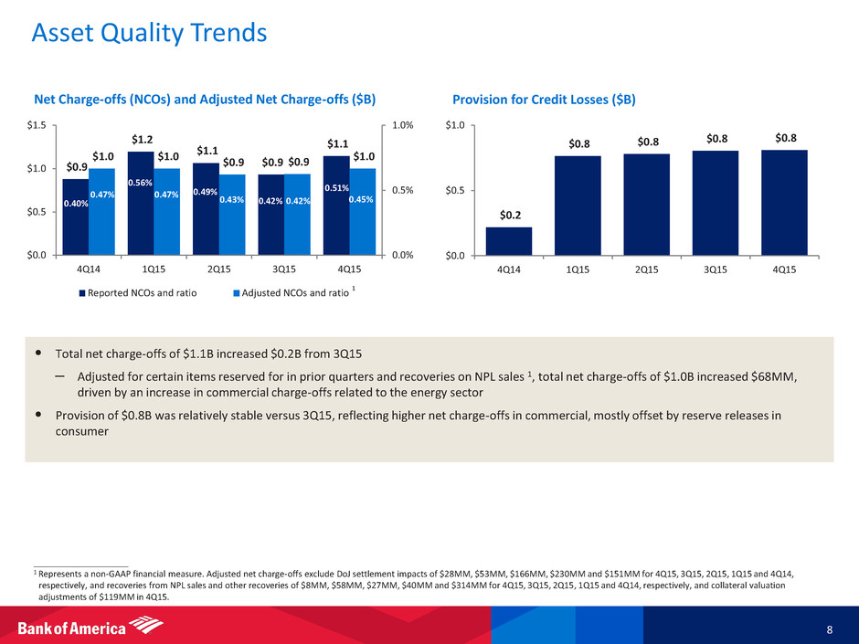 Loans & Leases and Deposits (EOP, $B) 7 ____________________ Note: Amounts may not total due to rounding. 1 Beginning with new originations in 2014, we retain certain residential mortgages in Consumer Banking, consistent with where the overall relationship is managed; previously such mortgages were retained in All Other. 2 Includes Consumer Banking, GWIM, Global Banking and Global Markets (GM). Total Loans & Leases LAS and All Other Loans & Leases $881 $878 $886 $888 $903 $0 $250 $500 $750 $1,000 4Q14 1Q15 2Q15 3Q15 4Q15 173 160 147 131 125 33 32 30 28 27 $206 $192 $177 $159 $152 $0 $50 $100 $150 $200 $250 4Q14 1Q15 2Q15 3Q15 4Q15 All Other Legacy Assets & Servicing (LAS) 390 401 416 429 444 286 286 294 300 308 $676 $686 $710 $729 $751 $0 $200 $400 $600 $800 4Q14 1Q15 2Q15 3Q15 4Q15 Commercial Consumer 524 549 547 552 573 245 244 238 246 261 280 290 292 298 296 70 70 73 66 67 $1,119 $1,153 $1,150 $1,162 $1,197 $0 $300 $600 $900 $1,200 4Q14 1Q15 2Q15 3Q15 4Q15 Consumer Banking GWIM Global Banking Other (GM, LAS, All Other) 1 Total Deposits Loans & Leases in Primary Lending Segments 2