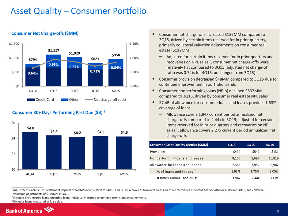 $0.9 $1.2 $1.1 $0.9 $1.1 $1.0 $1.0 $0.9 $0.9 $1.0 0.47% 0.47% 0.43% 0.42% 0.45% 0.40% 0.56% 0.49% 0.42% 0.51% 0.0% 0.5% 1.0% $0.0 $0.5 $1.0 $1.5 4Q14 1Q15 2Q15 3Q15 4Q15 Reported NCOs and ratio Adjusted NCOs and ratio ____________________ 1 Represents a non-GAAP financial measure. Adjusted net charge-offs exclude DoJ settlement impacts of $28MM, $53MM, $166MM, $230MM and $151MM for 4Q15, 3Q15, 2Q15, 1Q15 and 4Q14, respectively, and recoveries from NPL sales and other recoveries of $8MM, $58MM, $27MM, $40MM and $314MM for 4Q15, 3Q15, 2Q15, 1Q15 and 4Q14, respectively, and collateral valuation adjustments of $119MM in 4Q15. Asset Quality Trends 8 Net Charge-offs (NCOs) and Adjusted Net Charge-offs ($B) Provision for Credit Losses ($B) $0.2 $0.8 $0.8 $0.8 $0.8 $0.0 $0.5 $1.0 4Q14 1Q15 2Q15 3Q15 4Q15 1 • Total net charge-offs of $1.1B increased $0.2B from 3Q15 – Adjusted for certain items reserved for in prior quarters and recoveries on NPL sales 1, total net charge-offs of $1.0B increased $68MM, driven by an increase in commercial charge-offs related to the energy sector • Provision of $0.8B was relatively stable versus 3Q15, reflecting higher net charge-offs in commercial, mostly offset by reserve releases in consumer