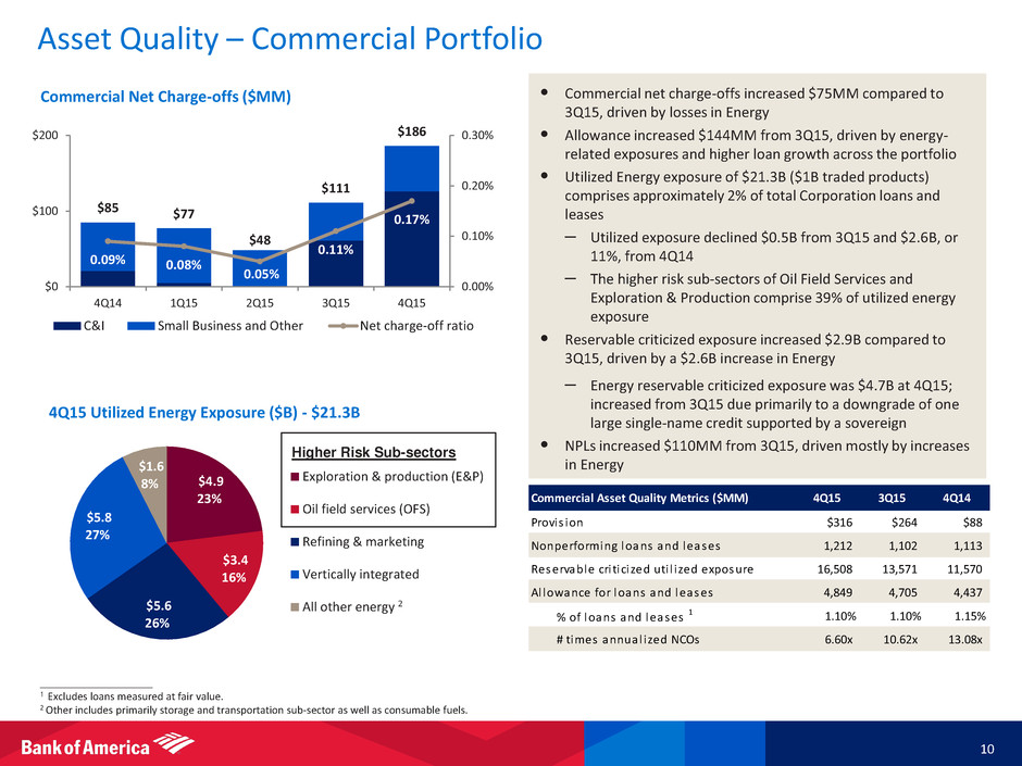 Asset Quality – Consumer Portfolio 9 Consumer Net Charge-offs ($MM) $794 $1,117 $1,020 $821 $958 0.64% 0.95% 0.87% 0.71% 0.84% 0.00% 0.50% 1.00% 1.50% $0 $500 $1,000 $1,500 4Q14 1Q15 2Q15 3Q15 4Q15 Credit Card Other Net charge-off ratio Consumer Asset Quality Metrics ($MM) 4Q15 3Q15 4Q14 Provis ion $494 $542 $131 Nonperforming loans and leases 8,165 8,697 10,819 Al lowance for loans and leases 7,385 7,952 9,982 % of loans and leases 3 1.63% 1.75% 2.05% # times annual ized NCOs 1.94x 2.44x 3.17x ____________________ 1 Adjustments include DoJ settlement impacts of $28MM and $53MM for 4Q15 and 3Q15, recoveries from NPL sales and other recoveries of $8MM and $58MM for 4Q15 and 3Q15, and collateral valuation adjustments of $119MM in 4Q15. 2 Excludes FHA-insured loans and other loans individually insured under long-term standby agreements. 3 Excludes loans measured at fair value. Consumer 30+ Days Performing Past Due ($B) 2 $4.8 $4.4 $4.2 $4.3 $4.3 $0 $2 $4 $6 4Q14 1Q15 2Q15 3Q15 4Q15 • Consumer net charge-offs increased $137MM compared to 3Q15, driven by certain items reserved for in prior quarters, primarily collateral valuation adjustments on consumer real estate ($119MM) – Adjusted for certain items reserved for in prior quarters and recoveries on NPL sales 1, consumer net charge-offs were relatively flat compared to 3Q15 (adjusted net charge-off ratio was 0.72% for 4Q15, unchanged from 3Q15) • Consumer provision decreased $48MM compared to 3Q15 due to continued improvement in portfolio trends • Consumer nonperforming loans (NPLs) declined $532MM compared to 3Q15, driven by consumer real estate NPL sales • $7.4B of allowance for consumer loans and leases provides 1.63% coverage of loans – Allowance covers 1.94x current period annualized net charge-offs compared to 2.44x in 3Q15; adjusted for certain items reserved for in prior quarters and recoveries on NPL sales 1, allowance covers 2.27x current period annualized net charge-offs