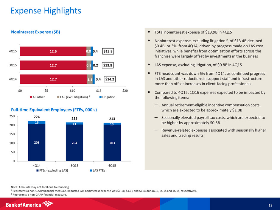 12.7 12.7 12.6 1.1 0.9 0.8 0.4 0.2 0.4 $14.2 $13.8 $13.9 $0 $5 $10 $15 $20 4Q14 3Q15 4Q15 All other LAS (excl. litigation) Litigation Expense Highlights ____________________ Note: Amounts may not total due to rounding. 1 Represents a non-GAAP financial measure. Reported LAS noninterest expense was $1.1B, $1.1B and $1.4B for 4Q15, 3Q15 and 4Q14, respectively. 2 Represents a non-GAAP financial measure. • Total noninterest expense of $13.9B in 4Q15 • Noninterest expense, excluding litigation 2, of $13.4B declined $0.4B, or 3%, from 4Q14, driven by progress made on LAS cost initiatives, while benefits from optimization efforts across the franchise were largely offset by investments in the business • LAS expense, excluding litigation, of $0.8B in 4Q15 • FTE headcount was down 5% from 4Q14, as continued progress in LAS and other reductions in support staff and infrastructure more than offset increases in client-facing professionals • Compared to 4Q15, 1Q16 expenses expected to be impacted by the following items: – Annual retirement-eligible incentive compensation costs, which are expected to be approximately $1.0B – Seasonally elevated payroll tax costs, which are expected to be higher by approximately $0.3B – Revenue-related expenses associated with seasonally higher sales and trading results Noninterest Expense ($B) Full-time Equivalent Employees (FTEs, 000's) 12 1 208 204 203 16 11 10 224 215 213 0 50 100 150 200 250 4Q14 3Q15 4Q15 FTEs (excluding LAS) LAS FTEs