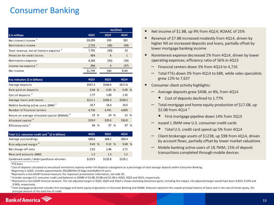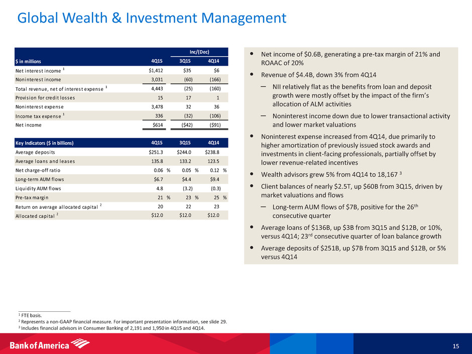 70.5 69.3 68.8 69.2 68.4 6.8 6.9 7.0 7.2 7.6 0 2 4 6 8 10 0 20 40 60 80 4Q14 1Q15 2Q15 3Q15 4Q15 FTEs Sales specialists Consumer Banking Trends 14 • #1 Retail Deposit Market Share 1 • #3 in U.S. Credit Card Balances 2 • #1 Home Equity Lender (Inside Mortgage Finance ‘15) • #3 in J.D. Power 2015 U.S. Primary Mortgage Origination Satisfaction Study • #1 in Online Banking Functionality (Keynote ’15) • #1 in Mobile Banking (Keynote ’15) • #2 Small Business Lender (FDIC ‘15) • #1 in Prime Auto Credit mix among peers 3 1.3 1.2 1.2 1.2 1.3 1.0 1.0 1.0 1.1 1.0 0.2 0.3 0.3 0.2 0.1 0.2 0.2 0.1 0.3 0.2 $2.8 $2.6 $2.6 $2.8 $2.7 $0 $1 $2 $3 4Q14 1Q15 2Q15 3Q15 4Q15 Card income Service charges Mortgage banking income All other income 11.6 13.7 16.0 13.7 13.5 3.4 3.2 3.2 3.1 3.5 $15.0 $16.9 $19.2 $16.9 $17.0 $0 $7 $14 $21 4Q14 1Q15 2Q15 3Q15 4Q15 Residential mortgage loans Home equity 524 549 547 552 573 202 200 204 209 214 114 118 122 117 123 $840 $868 $874 $878 $910 $0 $250 $500 $750 $1,000 4Q14 1Q15 2Q15 3Q15 4Q15 Deposits Loans and leases Client brokerage assets ____________________ Note: Amounts may not total due to rounding. 1 Source: SNL branch data. U.S. retail deposit market share based on June 2015 FDIC deposit data, adjusted to remove commercial balances. 2 Source: Competitor 3Q15 earnings releases. 3 Largest percentage of 740+ Scorex customers among key competitors as of October 2015. Source: Total Units Experian Autocount Risk Loan Analysis Scorex + (Loans, New & Used, Franchised Dealers). 4 Beginning with new originations in 2014, we retain certain residential mortgages in Consumer Banking, consistent with where the overall relationship is managed; previously such mortgages were retained in All Other. 5 Total mortgage production includes first mortgage and home equity originations in Consumer Banking and GWIM. Amounts represent the unpaid principal balance of loans and in the case of home equity, the principal amount of the total line of credit. 86 86 84 85 86 38 38 39 41 42 46 45 45 44 43 9 11 14 17 21 20 20 19 19 19 $199 $200 $202 $206 $211 $0 $50 $100 $150 $200 $250 4Q14 1Q15 2Q15 3Q15 4Q15 U.S. consumer credit card Auto and specialty lending Home equity Residential mortgage Other Leading Consumer Franchise Total Mortgage Production ($B) 5 Average Loans and Leases ($B) Consumer Client Balances (EOP, $B) Full-Time Equivalent Employees (000’s) 4 Total Noninterest Income ($B)