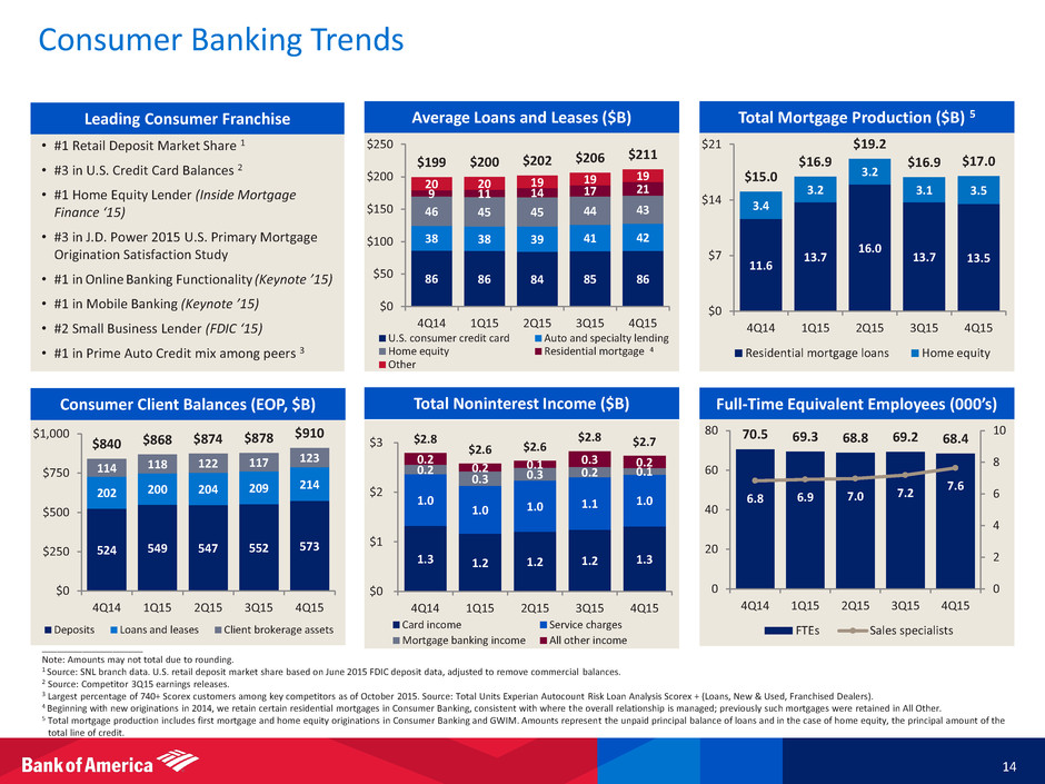 Consumer Banking 13 ____________________ 1 FTE basis. 2 Cost of deposits calculated as annualized noninterest expense within the Deposits subsegment as a percentage of total average deposits within Consumer Banking. 3 Beginning in 1Q15, includes approximately 150,000 Merrill Edge and MyMerrill users. 4 Represents a non-GAAP financial measure. For important presentation information, see slide 29. 5 Includes average U.S. consumer credit card balances in GWIM of $3.0B, $3.0B and $3.2B in 4Q15, 3Q15 and 4Q14, respectively. 6 Represents a non-GAAP financial measure. The risk-adjusted margin in 4Q15, 3Q15 and 4Q14 is shown excluding divestiture gains; including this impact, risk-adjusted margin would have been 9.81%, 9.54% and 9.96%, respectively. 7 Total mortgage production includes first mortgage and home equity originations in Consumer Banking and GWIM. Amounts represent the unpaid principal balance of loans and in the case of home equity, the principal amount of the total line of credit. • [ Bullets to come ] • Net income of $1.8B, up 9% from 4Q14; ROAAC of 25% Revenue f $7.8B increased modestly from 4Q14, driven by higher NII on increased deposits and loans, partially offset by lower mortgage banking income • Noninterest expense decreased 2% from 4Q14, driven by lower operating expenses; efficiency ratio of 56% in 4Q15 – Financial centers down 3% from 4Q14 to 4,726 – Total FTEs down 3% from 4Q14 to 68K, while sales specialists grew 12% to 7,637 • Consumer client activity highlights: – Average deposits grew $40B, or 8%, from 4Q14 Cost of deposits declined to 1.77% – Total mortgage and home equity production of $17.0B, up $2.0B from 4Q14 7 First mortgage pipeline down 14% from 3Q15 – Issued 1.3MM new U.S. consumer credit cards Total U.S. credit card spend up 5% from 4Q14 – Client brokerage assets of $123B, up $9B from 4Q14, driven by account flows, partially offset by lower market valuations – Mobile banking active users of 18.7MM; 15% of deposit transactions completed through mobile devices $ in millions Net interest income 1 $5,059 $55 $92 Noninterest income 2,733 (95) (59) Total revenue, net of interest expense 1 7,792 (40) 33 Provis ion for credit losses 654 6 1 Noninterest expense 4,343 (92) (76) Income tax expense 1 996 6 (37) Net income $1,799 $40 $145 Key Indicators ($ in billions) Average depos its $557.3 $548.9 $517.6 Rate paid on depos its 0.04 % 0.05 % 0.05 % Cost of depos its 2 1.77 1.80 1.92 Average loans and leases $211.1 $206.3 $199.2 Mobi le banking active users (MM) 3 18.7 18.4 16.5 Number of financia l centers 4,726 4,741 4,855 Return on average a l located capita l (ROAAC) 4 25 % 24 % 22 % Al located capita l 4 $29.0 $29.0 $30.0 Efficiency ratio 1 56 % 57 % 57 % Total U.S. consumer credit card 5 ($ in billions) Average outstandings $88.6 $88.2 $89.4 Risk-adjusted margin 6 9.43 % 9.32 % 9.69 % Net charge-off ratio 2.52 2.46 2.71 New card accounts (MM) 1.3 1.3 1.2 Combined credit / debit purchase volumes $129.5 $125.8 $125.1 4Q15 3Q15 4Q14 Inc/(Dec) 4Q15 3Q15 4Q14 4Q15 3Q15 4Q14