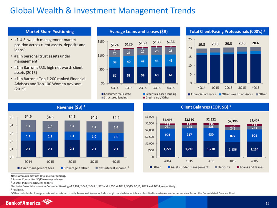 Global Wealth & Investment Management 15 ____________________ 1 FTE basis. 2 Represents a non-GAAP financial measure. For important presentation information, see slide 29. 3 Includes financial advisors in Consumer Banking of 2,191 and 1,950 in 4Q15 and 4Q14. • Net income of $0.6B, generating a pre-tax margin of 21% and ROAAC of 20% • Revenue of $4.4B, down 3% from 4Q14 – NII relatively flat as the benefits from loan and deposit growth were mostly offset by the impact of the firm’s allocation of ALM activities – Noninterest income down due to lower transactional activity and lower market valuations • Noninterest expense increased from 4Q14, due primarily to higher amortization of previously issued stock awards and investments in client-facing professionals, partially offset by lower revenue-related incentives • Wealth advisors grew 5% from 4Q14 to 18,167 3 • Client balances of nearly $2.5T, up $60B from 3Q15, driven by market valuations and flows – Long-term AUM flows of $7B, positive for the 26th consecutive quarter • Average loans of $136B, up $3B from 3Q15 and $12B, or 10%, versus 4Q14; 23rd consecutive quarter of loan balance growth • Average deposits of $251B, up $7B from 3Q15 and $12B, or 5% versus 4Q14 $ in millions Net interest income 1 $1,412 $35 $6 Noninterest income 3,031 (60) (166) Total revenue, net of interest expense 1 4,443 (25) (160) Provis ion for credit losses 15 17 1 Noninterest expense 3,478 32 36 Income tax expense 1 336 (32) (106) Net income $614 ($42) ($91) Key Indicators ($ in billions) Average depos its $251.3 $244.0 $238.8 Average loans and leases 135.8 133.2 123.5 Net charge-off ratio 0.06 % 0.05 % 0.12 % Long-term AUM flows $6.7 $4.4 $9.4 Liquidi ty AUM flows 4.8 (3.2) (0.3) Pre-tax margin 21 % 23 % 25 % Return on average a l located capita l 2 20 22 23 Al located capita l 2 $12.0 $12.0 $12.0 Inc/(Dec) 4Q15 3Q15 4Q14 4Q15 3Q15 4Q14