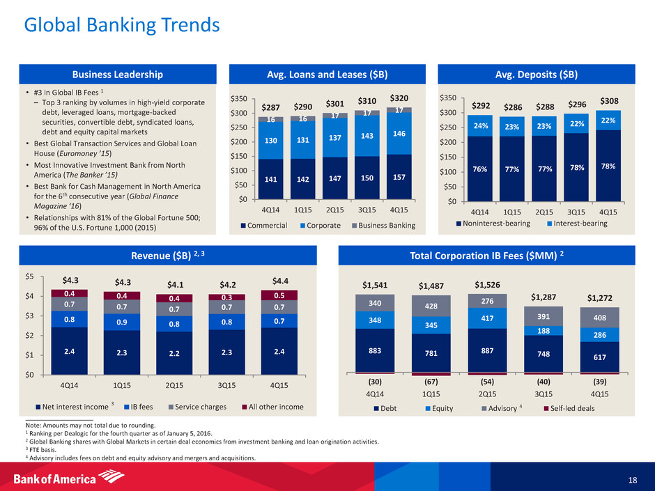 Global Banking 17 ____________________ 1 FTE basis. 2 Global Banking shares with Global Markets in certain deal economics from investment banking and loan origination activities. 3 Represents a non-GAAP financial measure. For important presentation information, see slide 29. 4 Ranking per Dealogic for the fourth quarter as of January 5, 2016. • [ Bullets to come ] • Net income of $1.4B, generating a ROAAC of 16% Revenue increased 1% from 4Q14 – NII improved driven by increased loan and deposit balances, partially offset by the impact of the firm’s allocation of ALM activities including liquidity costs, as well as loan spread compression – Noninterest income increased due to improvements in leasing and treasury services, as well as a small gain on the sale of a foreclosed property, partially offset by lower investment banking fees • Total Corporation investment banking fees of $1.3B (excl. self-led) declined 17% from 4Q14, driven by lower leveraged finance and equity issuance, partially offset by higher advisory fees – Ranked #3 globally in IB fees in 4Q15 4 – 2nd highest quarter in advisory fees since merger • Provision increased from 4Q14, driven by energy-related charge- offs, as well as reserve builds for loan growth and energy exposure • Noninterest expense decreased 2% versus 4Q14, reflecting lower litigation and incentive costs, partially offset by investments in client-facing professionals • Average loans and leases increased 3% from 3Q15 and 12% from 4Q14, driven by growth in C&I, commercial real estate and leasing • Average deposits grew 5% from 4Q14 $ in millions Net interest income 1 $2,435 $89 $20 Noninterest income 2 1,918 74 19 Total revenue, net of interest expense 1, 2 4,353 163 39 Provis ion for credit losses 233 54 264 Noninterest expense 1,938 (80) (31) Income tax expense 1 804 88 (52) Net income $1,378 $101 ($142) Key Indicators ($ in billions) Average depos its $307.8 $296.3 $292.1 Average loans and leases 320.3 310.0 287.0 Net charge-off ratio 0.17 % 0.07 % 0.00 % Total corporation IB fees (excl . sel f-led) 2 $1.27 $1.29 $1.54 Global Banking IB fees 2 0.73 0.75 0.83 Bus iness Lending revenue 2.03 1.89 1.88 Global Transaction S rvices revenue 1.59 1.57 1.63 Return on average a l located capita l 3 16 % 14 % 18 % Al located capita l 3 $35.0 $35.0 $33.5 Efficiency ratio 1 44 % 48 % 46 % Inc/(Dec) 3Q15 4Q144Q15 4Q15 3Q15 4Q14