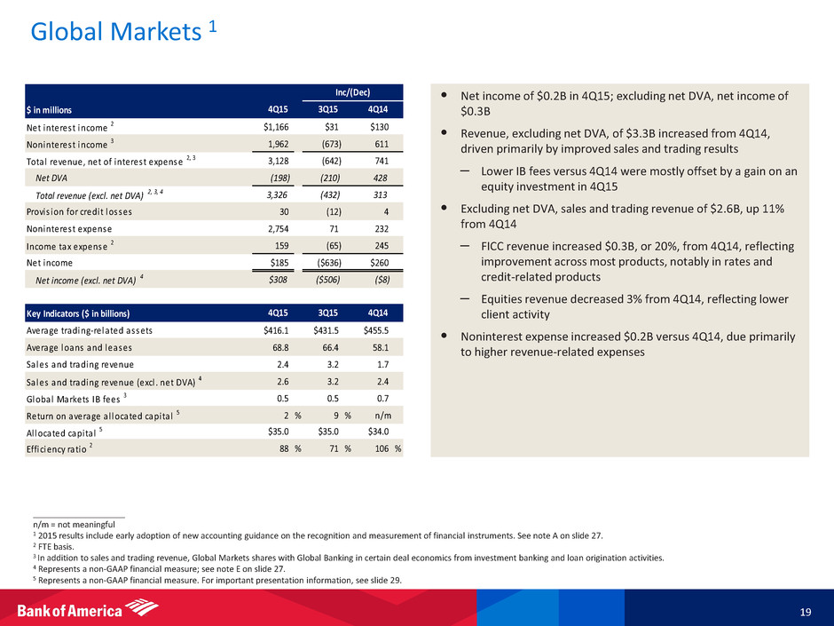 Global Banking Trends 18 ____________________ Note: Amounts may not total due to rounding. 1 Ranking per Dealogic for the fourth quarter as of January 5, 2016. 2 Global Banking shares with Global Markets in certain deal economics from investment banking and loan origination activities. 3 FTE basis. 4 Advisory includes fees on debt and equity advisory and mergers and acquisitions. 76% 77% 77% 78% 78% 24% 23% 23% 22% 22% $292 $286 $288 $296 $308 $0 $50 $100 $150 $200 $250 $300 $350 4Q14 1Q15 2Q15 3Q15 4Q15 Noninterest-bearing Interest-bearing 883 781 887 748 617 348 345 417 188 286 340 428 276 391 408 (30) (67) (54) (40) (39) $1,541 $1,487 $1,526 $1,287 $1,272 4Q14 1Q15 2Q15 3Q15 4Q15 Debt Equity Advisory Self-led deals Total Corporation IB Fees ($MM) 2 • #3 in Global IB Fees 1 – Top 3 ranking by volumes in high-yield corporate debt, leveraged loans, mortgage-backed securities, convertible debt, syndicated loans, debt and equity capital markets • Best Global Transaction Services and Global Loan House (Euromoney ’15) • Most Innovative Investment Bank from North America (The Banker ’15) • Best Bank for Cash Management in North America for the 6th consecutive year (Global Finance Magazine ‘16) • Relationships with 81% of the Global Fortune 500; 96% of the U.S. Fortune 1,000 (2015) 2.4 2.3 2.2 2.3 2.4 0.8 0.9 0.8 0.8 0.7 0.7 0.7 0.7 0.7 0.7 0.4 0.4 0.4 0.3 0.5 $4.3 $4.3 $4.1 $4.2 $4.4 $0 $1 $2 $3 $4 $5 4Q14 1Q15 2Q15 3Q15 4Q15 Net interest income IB fees Service charges All other income Revenue ($B) 2, 3 4 Avg. Deposits ($B) Business Leadership Avg. Loans and Leases ($B) 141 142 147 150 157 130 131 137 143 146 16 16 17 17 17 $287 $290 $301 $310 $320 $0 $50 $100 $150 $200 $250 $300 $350 4Q14 1Q15 2Q15 3Q15 4Q15 Commercial Corporate Business Banking 3