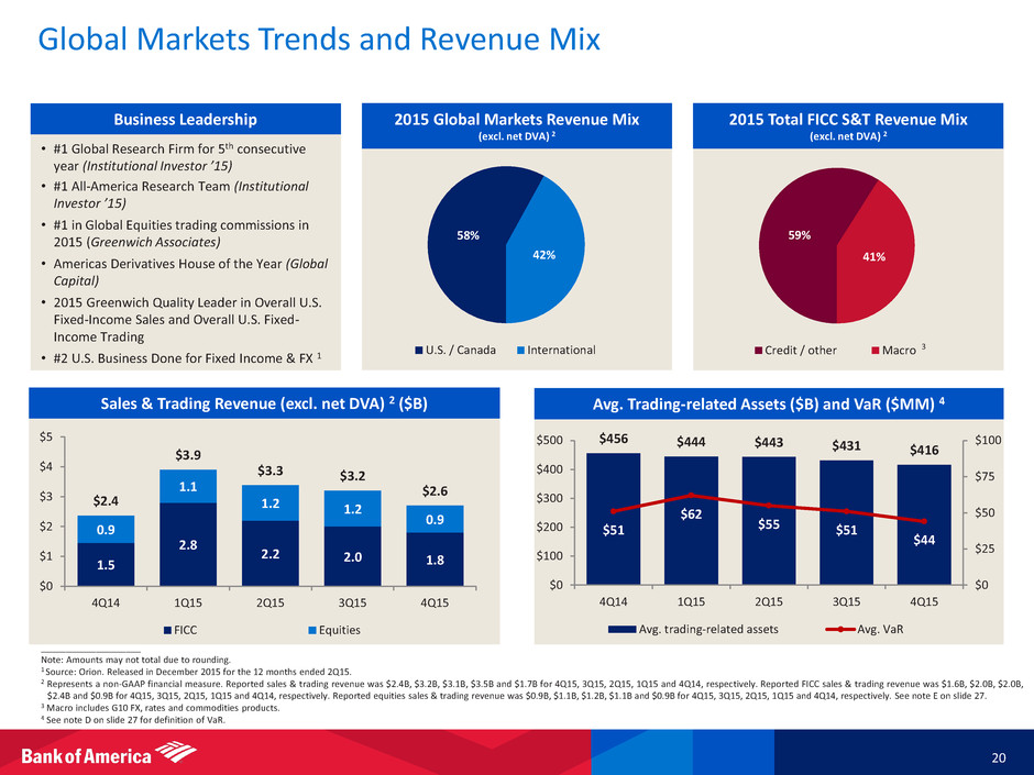 Global Markets 1 19 • [ Bullets to come ] ____________________ n/m = not meaningful 1 2015 results include early adoption of new accounting guidance on the recognition and measurement of financial instruments. See note A on slide 27. 2 FTE basis. 3 In addition to sales and trading revenue, Global Markets shares with Global Banking in certain deal economics from investment banking and loan origination activities. 4 Represents a non-GAAP financial measure; see note E on slide 27. 5 Represents a non-GAAP financial measure. For important presentation information, see slide 29. • Net income of $0.2B in 4Q15; excluding net DVA, net income of $0.3B • Revenue, excluding net DVA, of $3.3B increased from 4Q14, driven primarily by improved sales and trading results – Lower IB fees versus 4Q14 were mostly offset by a gain on an equity investment in 4Q15 • Excluding net DVA, sales and trading revenue of $2.6B, up 11% from 4Q14 – FICC revenue increased $0.3B, or 20%, from 4Q14, reflecting improvement across most products, notably in rates and credit-related products – Equities revenue decreased 3% from 4Q14, reflecting lower client activity • Noninterest expense increased $0.2B versus 4Q14, due primarily to higher revenue-related expenses $ in millions Net interest income 2 $1,166 $31 $130 Noninterest income 3 1,962 (673) 611 Total revenue, net of interest expense 2, 3 3,128 (642) 741 Net DVA (198) (210) 428 Total revenue (excl. net DVA) 2, 3, 4 3,326 (432) 313 Provis ion for credit losses 30 (12) 4 Noninterest expense 2,754 71 232 Income tax expense 2 159 (65) 245 Net income $185 ($636) $260 Net income (excl. net DVA) 4 $308 ($506) ($8) Key Indicators ($ in billions) Average trading-related assets $416.1 $431.5 $455.5 Average loans and leases 68.8 66.4 58.1 Sales and trading revenue 2.4 3.2 1.7 Sales and trading revenue (excl . net DVA) 4 2.6 3.2 2.4 Global Markets IB fees 3 0.5 0.5 0.7 Return on average a l located capita l 5 2 % 9 % n/m Al located capita l 5 $35.0 $35.0 $34.0 Efficiency ratio 2 88 % 71 % 106 % Inc/(Dec) 4Q15 3Q15 4Q14 4Q15 3Q15 4Q14