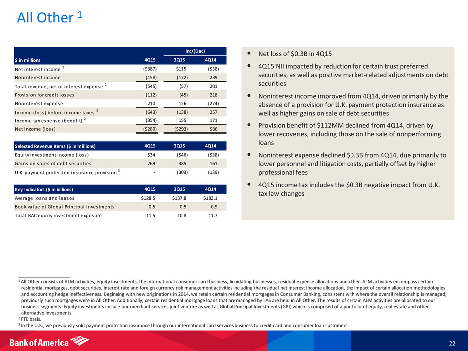 Legacy Assets & Servicing 21 • Net loss of $0.4B in 4Q15 • Total revenue declined from 4Q14, driven by a decrease in NII on lower loan balances, as well as a modest decline in noninterest income – Mortgage banking income relatively stable from 4Q14 as lower servicing fees and MSR net of hedge results were offset by lower representations and warranties provision • Provision benefit declined $0.1B from 4Q14, driven primarily by a slower pace of portfolio improvement • Litigation expense increased from 4Q14 • LAS expenses, excluding litigation, of $0.8B in 4Q15 – 60+ days delinquent first mortgage loans serviced down 46% from 4Q14 to 103K units in 4Q15 – LAS employees declined 35% from 4Q14 ____________________ 1 FTE basis. 2 Represents a non-GAAP financial measure. 3 Serviced by LAS employees. 4 Includes first mortgage and home equity. 5 Includes other FTEs supporting LAS (contractors). $ in millions Net interest income 1 $347 ($35) ($43) Noninterest income 241 (217) (7) Total revenue, net of interest expense 1 588 (252) (50) Provis ion for credit losses (10) (16) 103 Noninterest expense 1,148 6 (212) Litigation expense 353 125 97 Noninterest expense, excluding litigation 2 795 (119) (309) Income tax expense (benefi t) 1 (199) (87) 31 Net income (loss ) ($351) ($155) $28 Key Indicators ($ in billions) Average loans and leases $27.2 $29.1 $33.8 MSR (EOP) 2.7 2.7 3.3 Capita l i zed MSR (bps) 71 69 69 Loans serviced for investors (EOP) 378 391 474 Total LAS mortgage banking income 0.3 0.3 0.2 4Q15 4Q14 Inc/(Dec) 4Q15 3Q15 4Q14 3Q15 189 153 132 114 103 0 50 100 150 200 4Q14 1Q15 2Q15 3Q15 4Q15 LAS Employees 5 17.1K 15.5K 13.7K 12.3K 11.2K $461 $430 $392 $345 $353 5,272 5,120 4,701 4,481 4,351 0 2,000 4,000 6,000 8,000 10,000 $0 $200 $400 $600 4Q14 1Q15 2Q15 3Q15 4Q15 Servicing fees Total servicing portfolio Servicing Fees ($MM) and Servicing Portfolio (units in 000’s) 3 60+ Days Delinquent First Mortgage Loans (units in 000’s) 3 4