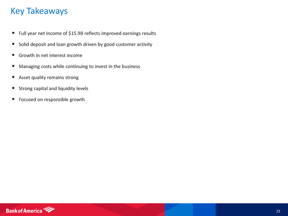 Key Takeaways 23 • Full year net income of $15.9B reflects improved earnings results • Solid deposit and loan growth driven by good customer activity • Growth in net interest income • Managing costs while continuing to invest in the business • Asset quality remains strong • Strong capital and liquidity levels • Focused on responsible growth