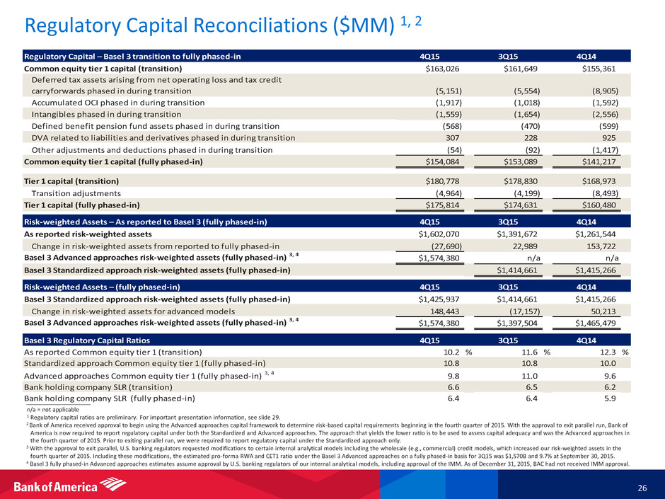 Notes 27 A In January 2016, the FASB issued new accounting guidance on recognition and measurement of financial instruments. The Corporation has early adopted, retrospective to January 1, 2015, the provision that requires the Corporation to present unrealized gains/losses resulting from changes in the Corporation's own credit spreads on liabilities accounted for under the fair value option (referred to as debit valuation adjustments, or DVA) in accumulated OCI. The impact of the adoption was to reclassify, as of January 1, 2015, unrealized DVA losses of $2.0B pretax ($1.2B after tax) from January 1, 2015 retained earnings to accumulated OCI. Further, pre-tax unrealized DVA gains of $301MM, $301MM and $420MM were reclassified from other income to accumulated OCI for 3Q15, 2Q15 and 1Q15, respectively. This had the effect of reducing net income as previously reported for the aforementioned quarters by $187MM, $186MM and $260MM, or approximately $0.02 per quarter. This change is reflected in consolidated results and the Global Markets segment results. Results for 2014 were not subject to restatement under the provisions of the new accounting guidance. B Global Excess Liquidity Sources include cash and high-quality, liquid, unencumbered securities, limited to U.S. government securities, U.S. agency securities, U.S. agency MBS, and a select group of non-U.S. government and supranational securities, and are readily available to meet funding requirements as they arise. It does not include Federal Reserve Discount Window or Federal Home Loan Bank borrowing capacity. Transfers of liquidity from the bank or other regulated entities are subject to certain regulatory restrictions. C Time to Required Funding (TTF) is a debt coverage measure and is expressed as the number of months unsecured holding company obligations of Bank of America Corporation can be met using only the BAC parent company’s Global Excess Liquidity Sources without issuing debt or sourcing additional liquidity. We define unsecured contractual obligations for purposes of this metric as maturities of senior or subordinated debt issued or guaranteed by Bank of America Corporation. For all periods shown, we have included in the amount of unsecured contractual obligations the liability, including estimated costs, for the previously announced BNY Mellon private-label securitization settlement. As of 4Q15, this amount was $8.5B. D VaR model uses historical simulation approach based on three years of historical data and an expected shortfall methodology equivalent to a 99% confidence level. Using a 95% confidence level, average VaR was $22MM, $24MM, $23MM, $30MM, $24MM, $39MM and $48MM for 4Q15, 3Q15, 2Q15, 1Q15, 4Q14, 4Q13 and 4Q12, respectively. E Revenue for all periods included net DVA on derivatives, as well as amortization of own credit portion of purchase discount and realized DVA on structured liabilities; periods prior to 2015 also included unrealized DVA on structured liabilities. In 4Q14, a funding valuation adjustment (FVA) on uncollateralized derivative transactions was implemented, and a transitional charge of $497MM related to the adoption was recorded and included in net DVA. Net DVA gains (losses) were ($198MM), $12MM, ($199MM), ($401MM) and ($626MM) for 4Q15, 3Q15, 2Q15, 1Q15 and 4Q14, respectively. Net DVA gains (losses) included in FICC revenue were ($190MM), $18MM, ($199MM), ($392MM) and ($577MM) for 4Q15, 3Q15, 2Q15, 1Q15 and 4Q14 and ($763MM), ($308MM), ($1.1B) and ($6.4B) for 2015, 2014, 2013 and 2012, respectively. Net DVA gains (losses) included in equities revenue were ($8MM), ($6MM), $0, ($9MM) and ($49MM) for 4Q15, 3Q15, 2Q15, 1Q15 and 4Q14 and ($23MM), $68MM, ($43MM) and ($1.2B) for 2015, 2014, 2013 and 2012, respectively. All amounts for 2015 reflect the adoption of the new accounting guidance as mentioned in note A above. F The numerator of the SLR is quarter-end Basel 3 Tier 1 capital. The denominator is total leverage exposure based on the daily average of the sum of on-balance sheet exposures less permitted Tier 1 deductions, as well as the simple average of certain off-balance sheet exposures, as of the end of each month in a quarter. Off-balance sheet exposures primarily include undrawn lending commitments, letters of credit, potential future derivative exposures and repo-style transactions. Differences between fully phased-in and transitional supplementary leverage exposures are immaterial. G Market-related NII adjustments include retrospective changes to debt security premium or discount amortization resulting from changes in estimated prepayments, due primarily to changes in interest rates, and hedge ineffectiveness. Amortization of premiums and accretion of discounts are included in interest income. When a change is made to the estimated lives of the securities, primarily as a result of changes in interest rates, the related premium or discount is adjusted, with a corresponding charge or benefit to interest income, to the appropriate amount had the current estimated lives been applied since the purchase of the securities. For more information, see Note 1 – Summary of Significant Accounting Principles to the Consolidated Financial Statements of the Corporation’s 2014 Annual Report on Form 10-K.