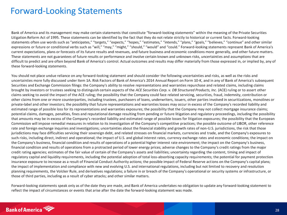 Forward-Looking Statements 28 Bank of America and its management may make certain statements that constitute “forward-looking statements” within the meaning of the Private Securities Litigation Reform Act of 1995. These statements can be identified by the fact that they do not relate strictly to historical or current facts. Forward-looking statements often use words such as “anticipates,” “targets,” “expects,” “hopes,” “estimates,” “intends,” “plans,” “goals,” “believes,” “continue” and other similar expressions or future or conditional verbs such as “will,” “may,” “might,” “should,” “would” and “could.” Forward-looking statements represent Bank of America's current expectations, plans or forecasts of its future results and revenues, and future business and economic conditions more generally, and other future matters. These statements are not guarantees of future results or performance and involve certain known and unknown risks, uncertainties and assumptions that are difficult to predict and are often beyond Bank of America's control. Actual outcomes and results may differ materially from those expressed in, or implied by, any of these forward-looking statements. You should not place undue reliance on any forward-looking statement and should consider the following uncertainties and risks, as well as the risks and uncertainties more fully discussed under Item 1A. Risk Factors of Bank of America's 2014 Annual Report on Form 10-K, and in any of Bank of America's subsequent Securities and Exchange Commission filings: the Company's ability to resolve representations and warranties repurchase and related claims, including claims brought by investors or trustees seeking to distinguish certain aspects of the ACE Securities Corp. v. DB Structured Products, Inc. (ACE) ruling or to assert other claims seeking to avoid the impact of the ACE ruling; the possibility that the Company could face related servicing, securities, fraud, indemnity, contribution or other claims from one or more counterparties, including trustees, purchasers of loans, underwriters, issuers, other parties involved in securitizations, monolines or private-label and other investors; the possibility that future representations and warranties losses may occur in excess of the Company's recorded liability and estimated range of possible loss for its representations and warranties exposures; the possibility that the Company may not collect mortgage insurance claims; potential claims, damages, penalties, fines and reputational damage resulting from pending or future litigation and regulatory proceedings, including the possibility that amounts may be in excess of the Company’s recorded liability and estimated range of possible losses for litigation exposures; the possibility that the European Commission will impose remedial measures in relation to its investigation of the Company's competitive practices; the possible outcome of LIBOR, other reference rate and foreign exchange inquiries and investigations; uncertainties about the financial stability and growth rates of non-U.S. jurisdictions, the risk that those jurisdictions may face difficulties servicing their sovereign debt, and related stresses on financial markets, currencies and trade, and the Company's exposures to such risks, including direct, indirect and operational; the impact of U.S. and global interest rates, currency exchange rates and economic conditions; the impact on the Company's business, financial condition and results of operations of a potential higher interest rate environment; the impact on the Company’s business, financial condition and results of operations from a protracted period of lower energy prices; adverse changes to the Company's credit ratings from the major credit rating agencies; estimates of the fair value of certain of the Company's assets and liabilities; uncertainty regarding the content, timing and impact of regulatory capital and liquidity requirements, including the potential adoption of total loss-absorbing capacity requirements; the potential for payment protection insurance exposure to increase as a result of Financial Conduct Authority actions; the possible impact of Federal Reserve actions on the Company’s capital plans; the impact of implementation and compliance with new and evolving U.S. and international regulations, including but not limited to recovery and resolution planning requirements, the Volcker Rule, and derivatives regulations; a failure in or breach of the Company’s operational or security systems or infrastructure, or those of third parties, including as a result of cyber attacks; and other similar matters. Forward-looking statements speak only as of the date they are made, and Bank of America undertakes no obligation to update any forward-looking statement to reflect the impact of circumstances or events that arise after the date the forward-looking statement was made.