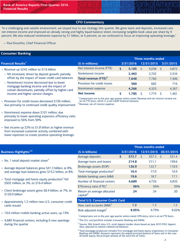 Bank of America Reports First-Quarter 2016 Financial Results 2 CFO Commentary Consumer Banking Three months ended Financial Results1 ($ in millions) 3/31/2016 12/31/2015 3/31/2015 Net interest income (FTE) $ 5,185 $ 5,058 $ 4,872 Noninterest income 2,463 2,702 2,534 Total revenue (FTE)2 7,648 7,760 7,406 Provision for credit losses 560 682 716 Noninterest expense 4,266 4,325 4,367 Net income $ 1,785 $ 1,774 $ 1,461 1 Comparisons are to the year-ago quarter unless noted. Revenue and net interest income are on an FTE basis, which is a non-GAAP financial measure. 2 Revenue, net of interest expense. Three months ended Business Highlights1,2 ($ in billions) 3/31/2016 12/31/2015 03/31/2015 Average deposits $ 572.7 $ 557.3 $ 531.4 Average loans and leases 214.8 211.1 199.6 Brokerage assets (EOP) 126.9 122.7 118.5 Total mortgage production4 16.4 17.0 16.9 Mobile banking users (MM) 19.6 18.7 17.1 Number of financial centers 4,689 4,726 4,835 Efficiency ratio (FTE)1 56% 56% 59% Return on average allocated capital(I) 24 24 20 Total U.S. Consumer Credit Card New card accounts (MM)2 1.2 1.3 1.2 Risk-adjusted margin2 9.05% 9.79% 9.02% 1 Comparisons are to the year-ago quarter unless noted. Efficiency ratio is on an FTE basis. 2 The U.S. card portfolio includes Consumer Banking and GWIM. 3 Source: SNL branch data, U.S. retail deposit market share based on June 2015 FDIC deposit data, adjusted to remove commercial balances. 4 Total mortgage production includes first mortgage and home equity originations in Consumer Banking and GWIM. Amounts represent the unpaid principal balance of loans and in the case of home equity, the principal amount of the total line of credit. "In a challenging and volatile environment, we stayed true to our strategy this quarter. We grew loans and deposits, increased core net interest income and improved an already strong and highly liquid balance sheet, increasing tangible book value per share by 9 percent. We also reduced noninterest expense by $1 billion, or 6 percent, as we continued to focus on improving operating leverage." — Paul Donofrio, Chief Financial Officer • Revenue up $242 million to $7.6 billion – NII increased, driven by deposit growth, partially offset by the impact of lower credit card balances – Noninterest income decreased due to lower mortgage banking income and the impact of certain divestitures, partially offset by higher card income and higher service charges • Provision for credit losses decreased $156 million, due primarily to continued credit quality improvement • Noninterest expense down $101 million, due primarily to lower operating expenses; efficiency ratio improved to 56% from 59% • Net income up 22% to $1.8 billion as higher revenue from increased customer activity combined with lower expenses to create positive operating leverage • No. 1 retail deposit market share3 • Average deposit balances grew $41.3 billion, or 8%, and average loan balances grew $15.2 billion, or 8% • Total mortgage and home equity production4 fell $502 million, or 3%, to $16.4 billion • Client brokerage assets grew $8.4 billion, or 7%, to $126.9 billion • Approximately 1.2 million new U.S. consumer credit cards issued • 19.6 million mobile banking active users, up 15% • 4,689 financial centers, including 6 new openings during the quarter