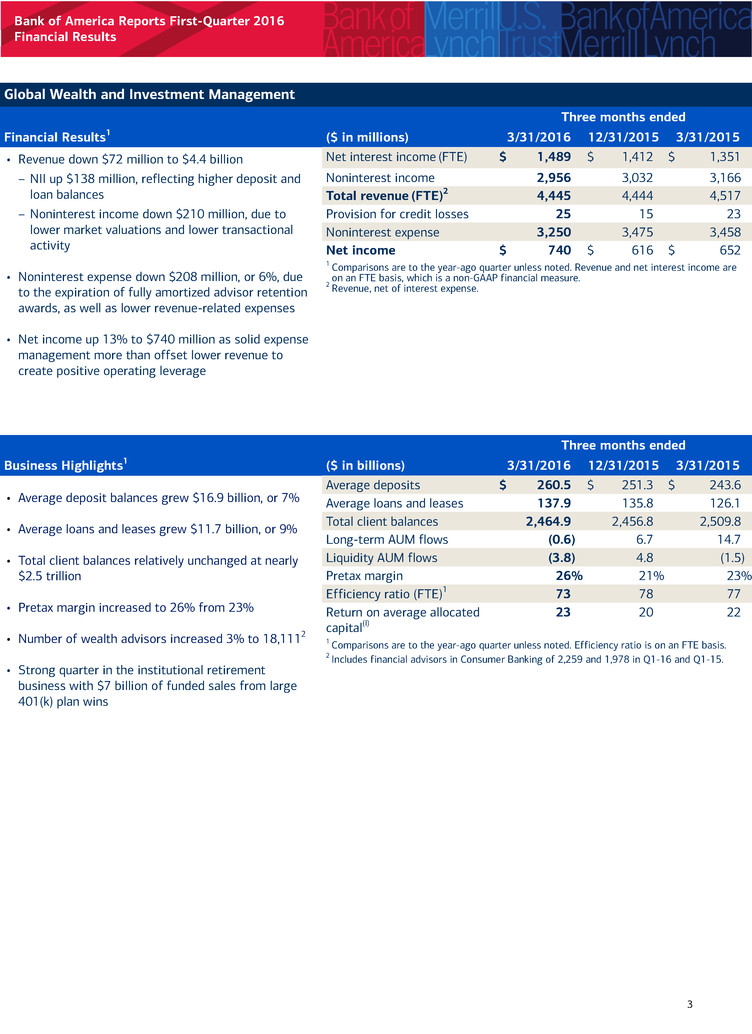 Bank of America Reports First-Quarter 2016 Financial Results 1 Financial Highlights1 Business Segment Highlights1 Consumer Banking Global Wealth and Investment Management Global Banking Global Markets Legacy Assets and Servicing CEO Commentary Business Segments include Consumer Banking, Global Wealth & Investment Management, Global Banking, Global Markets, and Legacy Assets & Servicing with the remaining operations recorded in All Other. 1 Financial Highlights and Business Highlights compare to the year-ago quarter unless noted. Loan and deposit balances are shown on an end-of-period basis. Fully taxable-equivalent (FTE) basis for the corporation is a non-GAAP financial measure. See endnote (A) for more information. Total revenue, net of interest expense, on a GAAP basis, was $19.5 billion for Q1-16, and $20.9 billion in Q1-15. Net interest income, on a GAAP basis, was $9.2 billion for Q1-16, and $9.4 billion for Q1-15. Earnings per share is on a fully diluted basis. 2 Combined credit/debit spending excludes the impact of portfolio divestitures. Including divestitures, combined spending was up 3%. • Loans up $17.5 billion, deposits up $42.6 billion1 • Brokerage assets up 7% • Mobile banking users up 15% to 19.6 million • Total credit/debit card spending up 5%2 • Revenue, net of interest expense (FTE basis) of $19.7 billion(A) – Excluding market-related net interest income (NII) adjustments, revenue (FTE basis) was $20.9 billion, compared to $21.6 billion in Q1-15(A) • NII (FTE basis) of $9.4 billion(A) – Excluding market-related NII adjustments, NII increased to $10.6 billion from $10.1 billion in Q1-15(A) • Noninterest income of $10.3 billion, compared to $11.5 billion • Provision for credit losses of $997 million, compared to $765 million; net charge-offs declined to $1.1 billion from $1.2 billion • Noninterest expense declined 1.0 billion, or 6%, to $14.8 billion • Net income declined 13% to $2.7 billion, earnings per diluted share of $0.21 compared to $0.25 – Results include pretax $1.2 billion ($0.07 per share) negative impact for market-related NII adjustments and pretax $0.9 billion ($0.05 per share) in annual retirement-eligible incentive costs Balance Sheet, Capital and Liquidity • Total deposit balances grew $64.1 billion to $1.2 trillion • Total loan balances grew $28.4 billion to $901.1 billion • Common equity tier 1 capital (transition) of $162.7 billion; common equity tier 1 capital (fully phased-in) of $157.5 billion(B) • Global Excess Liquidity Sources increased $47 billion to record $525 billion; time to required funding at 36 months(C) • Return on average assets 0.50%; return on average common equity 3.8%; return on average tangible common equity 5.4%(D) – Excluding NII adjustments and annual retirement-eligible incentive costs, return on average assets 0.73% and return on average tangible common equity 8.4%(D) • Tangible book value per share(E) increased 9% to $16.17; book value per share increased 7% to $23.12 • Repurchased $1.0 billion in common stock and paid $0.5 billion in common stock dividends • Total client balances of nearly $2.5 trillion • Loans up $10.9 billion, deposits up $16.5 billion1 • Pretax margin improved to 26% • Loans up $39.1 billion, deposits up $7.7 billion1 • Leading Global Investment Bank • Participated in 5 of top 10 debt and 7 of top 10 equity underwriting deals(F) • Excluding net DVA, sales and trading revenue down 16%(G) – Fixed income down 17%(G) – Equities down 11%(G) • Noninterest expense down 28% to $860 million; noninterest expense, excluding litigation, down 29% to $729 million(H) • Number of 60+ days delinquent first mortgage loans down 42% to 88,000 units Bank of America Reports Q1-16 Net Income of $2.7 Billion, EPS of $0.21 Results Include $1.2 Billion ($0.07 per Share) in Negative Market-Related NII Adjustments and $0.9 Billion ($0.05 per Share) in Annual Retirement-Eligible Incentive Compensation Costs "This quarter, we benefited from good consumer and commercial banking activity. Our business segments earned $4.5 billion, up 16 percent from the year-ago quarter. This was partially offset by valuation adjustments from lower long-term interest rates and annual compensation expenses. Despite volatile markets, our Global Markets business produced solid earnings. As always, we are focused on loan and deposit growth and managing expenses. By doing that, we continue to improve on what we do best: helping consumers live their financial lives and helping businesses grow and employ more people." — Brian Moynihan, Chief Executive Officer