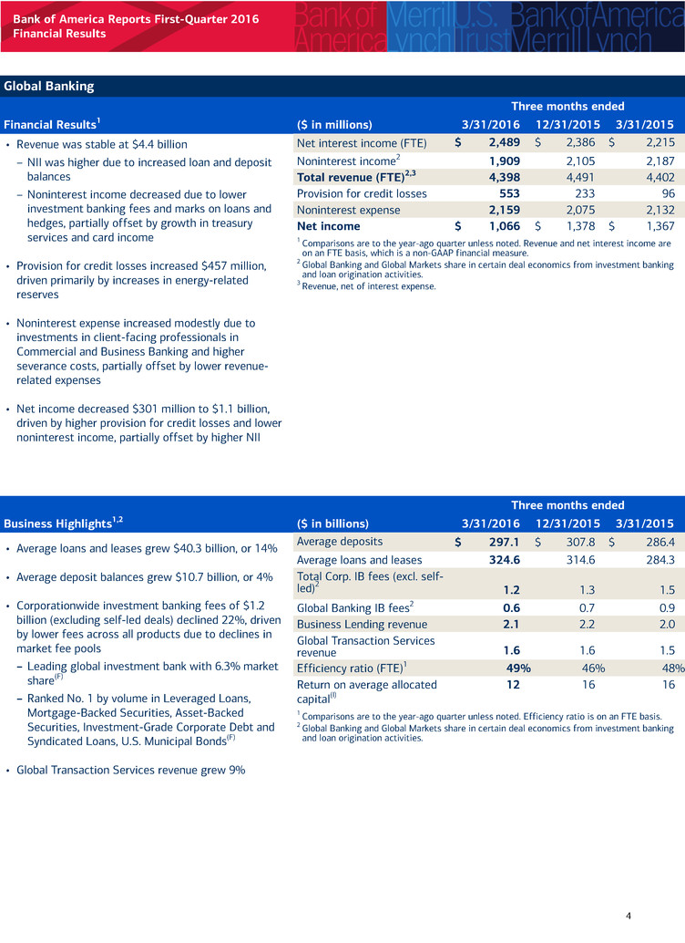 Bank of America Reports First-Quarter 2016 Financial Results 3 Global Wealth and Investment Management Three months ended Financial Results1 ($ in millions) 3/31/2016 12/31/2015 3/31/2015 Net interest income (FTE) $ 1,489 $ 1,412 $ 1,351 Noninterest income 2,956 3,032 3,166 Total revenue (FTE)2 4,445 4,444 4,517 Provision for credit losses 25 15 23 Noninterest expense 3,250 3,475 3,458 Net income $ 740 $ 616 $ 652 1 Comparisons are to the year-ago quarter unless noted. Revenue and net interest income are on an FTE basis, which is a non-GAAP financial measure. 2 Revenue, net of interest expense. Three months ended Business Highlights1 ($ in billions) 3/31/2016 12/31/2015 3/31/2015 Average deposits $ 260.5 $ 251.3 $ 243.6 Average loans and leases 137.9 135.8 126.1 Total client balances 2,464.9 2,456.8 2,509.8 Long-term AUM flows (0.6) 6.7 14.7 Liquidity AUM flows (3.8) 4.8 (1.5) Pretax margin 26% 21% 23% Efficiency ratio (FTE)1 73 78 77 Return on average allocated capital(I) 23 20 22 1 Comparisons are to the year-ago quarter unless noted. Efficiency ratio is on an FTE basis. 2 Includes financial advisors in Consumer Banking of 2,259 and 1,978 in Q1-16 and Q1-15. • Revenue down $72 million to $4.4 billion – NII up $138 million, reflecting higher deposit and loan balances – Noninterest income down $210 million, due to lower market valuations and lower transactional activity • Noninterest expense down $208 million, or 6%, due to the expiration of fully amortized advisor retention awards, as well as lower revenue-related expenses • Net income up 13% to $740 million as solid expense management more than offset lower revenue to create positive operating leverage • Average deposit balances grew $16.9 billion, or 7% • Average loans and leases grew $11.7 billion, or 9% • Total client balances relatively unchanged at nearly $2.5 trillion • Pretax margin increased to 26% from 23% • Number of wealth advisors increased 3% to 18,1112 • Strong quarter in the institutional retirement business with $7 billion of funded sales from large 401(k) plan wins