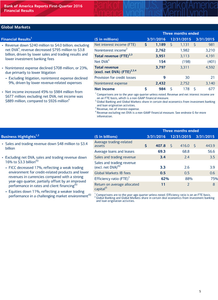 Bank of America Reports First-Quarter 2016 Financial Results 4 Global Banking Three months ended Financial Results1 ($ in millions) 3/31/2016 12/31/2015 3/31/2015 Net interest income (FTE) $ 2,489 $ 2,386 $ 2,215 Noninterest income2 1,909 2,105 2,187 Total revenue (FTE)2,3 4,398 4,491 4,402 Provision for credit losses 553 233 96 Noninterest expense 2,159 2,075 2,132 Net income $ 1,066 $ 1,378 $ 1,367 1 Comparisons are to the year-ago quarter unless noted. Revenue and net interest income are on an FTE basis, which is a non-GAAP financial measure. 2 Global Banking and Global Markets share in certain deal economics from investment banking and loan origination activities. 3 Revenue, net of interest expense. Three months ended Business Highlights1,2 ($ in billions) 3/31/2016 12/31/2015 3/31/2015 Average deposits $ 297.1 $ 307.8 $ 286.4 Average loans and leases 324.6 314.6 284.3 Total Corp. IB fees (excl. self- led)2 1.2 1.3 1.5 Global Banking IB fees2 0.6 0.7 0.9 Business Lending revenue 2.1 2.2 2.0 Global Transaction Services revenue 1.6 1.6 1.5 Efficiency ratio (FTE)1 49% 46% 48% Return on average allocated capital(I) 12 16 16 1 Comparisons are to the year-ago quarter unless noted. Efficiency ratio is on an FTE basis. 2 Global Banking and Global Markets share in certain deal economics from investment banking and loan origination activities. • Revenue was stable at $4.4 billion – NII was higher due to increased loan and deposit balances – Noninterest income decreased due to lower investment banking fees and marks on loans and hedges, partially offset by growth in treasury services and card income • Provision for credit losses increased $457 million, driven primarily by increases in energy-related reserves • Noninterest expense increased modestly due to investments in client-facing professionals in Commercial and Business Banking and higher severance costs, partially offset by lower revenue- related expenses • Net income decreased $301 million to $1.1 billion, driven by higher provision for credit losses and lower noninterest income, partially offset by higher NII • Average loans and leases grew $40.3 billion, or 14% • Average deposit balances grew $10.7 billion, or 4% • Corporationwide investment banking fees of $1.2 billion (excluding self-led deals) declined 22%, driven by lower fees across all products due to declines in market fee pools – Leading global investment bank with 6.3% market share(F) – Ranked No. 1 by volume in Leveraged Loans, Mortgage-Backed Securities, Asset-Backed Securities, Investment-Grade Corporate Debt and Syndicated Loans, U.S. Municipal Bonds(F) • Global Transaction Services revenue grew 9%