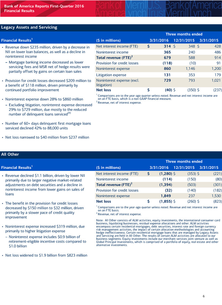 Bank of America Reports First-Quarter 2016 Financial Results 5 Global Markets Three months ended Financial Results1 ($ in millions) 3/31/2016 12/31/2015 3/31/2015 Net interest income (FTE) $ 1,189 $ 1,131 $ 981 Noninterest income2 2,762 1,982 3,210 Total revenue (FTE)2,3 3,951 3,113 4,191 Net DVA4 154 (198) (401) Total revenue (excl. net DVA) (FTE)2,3,4 3,797 3,311 4,592 Provision for credit losses 9 30 21 Noninterest expense 2,432 2,752 3,140 Net income $ 984 $ 178 $ 677 Three months ended Business Highlights1,2 ($ in billions) 3/31/2016 12/31/2015 3/31/2015 Average trading-related assets $ 407.8 $ 416.0 $ 443.9 Average loans and leases 69.3 68.8 56.6 Sales and trading revenue 3.4 2.4 3.5 Sales and trading revenue (excl. net DVA)(G) 3.3 2.6 3.9 Global Markets IB fees 0.5 0.5 0.6 Efficiency ratio (FTE)1 62% 88% 75% Return on average allocated capital(I) 11 2 8 1 Comparisons are to the year-ago quarter unless noted. Efficiency ratio is on an FTE basis. 2 Global Banking and Global Markets share in certain deal economics from investment banking and loan origination activities. • Revenue down $240 million to $4.0 billion; excluding net DVA4, revenue decreased $795 million to $3.8 billion, driven by lower sales and trading results and lower investment banking fees • Noninterest expense declined $708 million, or 23%, due primarily to lower litigation – Excluding litigation, noninterest expense declined 9%, driven by lower revenue-related expenses • Net income increased 45% to $984 million from $677 million; excluding net DVA, net income was $889 million, compared to $926 million4 • Sales and trading revenue down $48 million to $3.4 billion • Excluding net DVA, sales and trading revenue down 16% to $3.3 billion(G) – FICC decreased 17%, reflecting a weak trading environment for credit-related products and lower revenues in currencies compared with a strong year-ago quarter, partially offset by an improved performance in rates and client financing(G) – Equities down 11%, reflecting a weaker trading performance in a challenging market environment(G) 1 Comparisons are to the year-ago quarter unless noted. Revenue and net interest income are on an FTE basis, which is a non-GAAP financial measure. 2 Global Banking and Global Markets share in certain deal economics from investment banking and loan origination activities. 3 Revenue, net of interest expense. 4 Revenue excluding net DVA is a non-GAAP financial measure. See endnote G for more information.