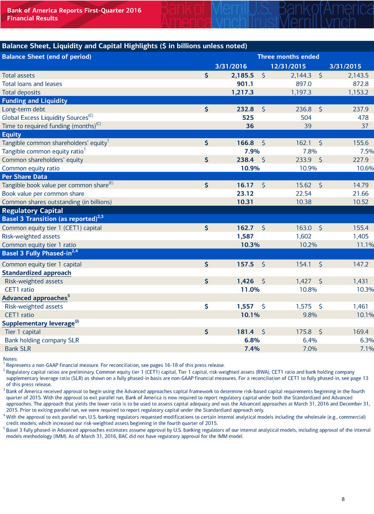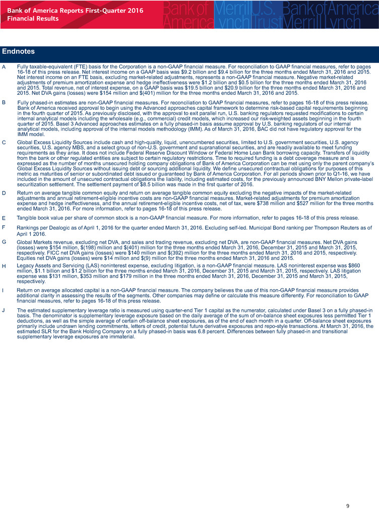 Bank of America Reports First-Quarter 2016 Financial Results 8 Balance Sheet, Liquidity and Capital Highlights ($ in billions unless noted) Balance Sheet (end of period) Three months ended 3/31/2016 12/31/2015 3/31/2015 Total assets $ 2,185.5 $ 2,144.3 $ 2,143.5 Total loans and leases 901.1 897.0 872.8 Total deposits 1,217.3 1,197.3 1,153.2 Funding and Liquidity Long-term debt $ 232.8 $ 236.8 $ 237.9 Global Excess Liquidity Sources(C) 525 504 478 Time to required funding (months)(C) 36 39 37 Equity Tangible common shareholders’ equity1 $ 166.8 $ 162.1 $ 155.6 Tangible common equity ratio1 7.9% 7.8% 7.5% Common shareholders’ equity $ 238.4 $ 233.9 $ 227.9 Common equity ratio 10.9% 10.9% 10.6% Per Share Data Tangible book value per common share(E) $ 16.17 $ 15.62 $ 14.79 Book value per common share 23.12 22.54 21.66 Common shares outstanding (in billions) 10.31 10.38 10.52 Regulatory Capital Basel 3 Transition (as reported)2,3 Common equity tier 1 (CET1) capital $ 162.7 $ 163.0 $ 155.4 Risk-weighted assets 1,587 1,602 1,405 Common equity tier 1 ratio 10.3% 10.2% 11.1% Basel 3 Fully Phased-in2,4 Common equity tier 1 capital $ 157.5 $ 154.1 $ 147.2 Standardized approach Risk-weighted assets $ 1,426 $ 1,427 $ 1,431 CET1 ratio 11.0% 10.8% 10.3% Advanced approaches5 Risk-weighted assets $ 1,557 $ 1,575 $ 1,461 CET1 ratio 10.1% 9.8% 10.1% Supplementary leverage(J) Tier 1 capital $ 181.4 $ 175.8 $ 169.4 Bank holding company SLR 6.8% 6.4% 6.3% Bank SLR 7.4% 7.0% 7.1% Notes: 1 Represents a non-GAAP financial measure. For reconciliation, see pages 16-18 of this press release. 2 Regulatory capital ratios are preliminary. Common equity tier 1 (CET1) capital, Tier 1 capital, risk-weighted assets (RWA), CET1 ratio and bank holding company supplementary leverage ratio (SLR) as shown on a fully phased-in basis are non-GAAP financial measures. For a reconciliation of CET1 to fully phased-in, see page 13 of this press release. 3 Bank of America received approval to begin using the Advanced approaches capital framework to determine risk-based capital requirements beginning in the fourth quarter of 2015. With the approval to exit parallel run, Bank of America is now required to report regulatory capital under both the Standardized and Advanced approaches. The approach that yields the lower ratio is to be used to assess capital adequacy and was the Advanced approaches at March 31, 2016 and December 31, 2015. Prior to exiting parallel run, we were required to report regulatory capital under the Standardized approach only. 4 With the approval to exit parallel run, U.S. banking regulators requested modifications to certain internal analytical models including the wholesale (e.g., commercial) credit models, which increased our risk-weighted assets beginning in the fourth quarter of 2015. 5 Basel 3 fully phased-in Advanced approaches estimates assume approval by U.S. banking regulators of our internal analytical models, including approval of the internal models methodology (IMM). As of March 31, 2016, BAC did not have regulatory approval for the IMM model.