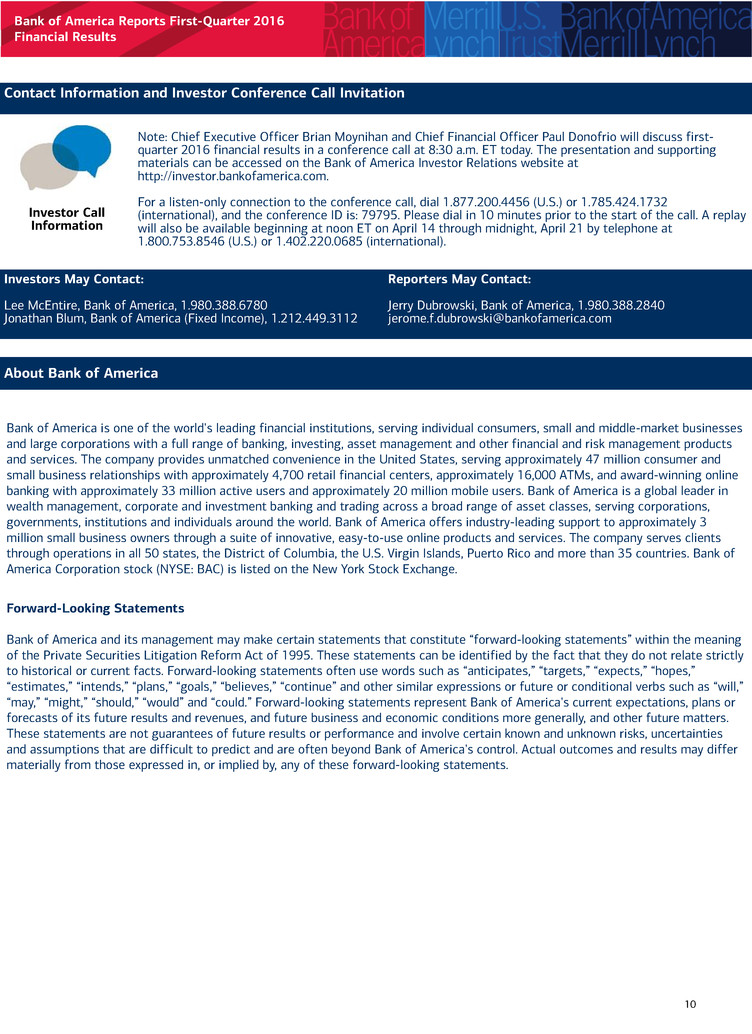Bank of America Reports First-Quarter 2016 Financial Results 9 Endnotes A B C D E F G H I J Fully taxable-equivalent (FTE) basis for the Corporation is a non-GAAP financial measure. For reconciliation to GAAP financial measures, refer to pages 16-18 of this press release. Net interest income on a GAAP basis was $9.2 billion and $9.4 billion for the three months ended March 31, 2016 and 2015. Net interest income on an FTE basis, excluding market-related adjustments, represents a non-GAAP financial measure. Negative market-related adjustments of premium amortization expense and hedge ineffectiveness were $1.2 billion and $0.5 billion for the three months ended March 31, 2016 and 2015. Total revenue, net of interest expense, on a GAAP basis was $19.5 billion and $20.9 billion for the three months ended March 31, 2016 and 2015. Net DVA gains (losses) were $154 million and $(401) million for the three months ended March 31, 2016 and 2015. Fully phased-in estimates are non-GAAP financial measures. For reconciliation to GAAP financial measures, refer to pages 16-18 of this press release. Bank of America received approval to begin using the Advanced approaches capital framework to determine risk-based capital requirements beginning in the fourth quarter of 2015. As previously disclosed, with the approval to exit parallel run, U.S. banking regulators requested modifications to certain internal analytical models including the wholesale (e.g., commercial) credit models, which increased our risk-weighted assets beginning in the fourth quarter of 2015. Basel 3 Advanced approaches estimates on a fully phased-in basis assume approval by U.S. banking regulators of our internal analytical models, including approval of the internal models methodology (IMM). As of March 31, 2016, BAC did not have regulatory approval for the IMM model. Global Excess Liquidity Sources include cash and high-quality, liquid, unencumbered securities, limited to U.S. government securities, U.S. agency securities, U.S. agency MBS, and a select group of non-U.S. government and supranational securities, and are readily available to meet funding requirements as they arise. It does not include Federal Reserve Discount Window or Federal Home Loan Bank borrowing capacity. Transfers of liquidity from the bank or other regulated entities are subject to certain regulatory restrictions. Time to required funding is a debt coverage measure and is expressed as the number of months unsecured holding company obligations of Bank of America Corporation can be met using only the parent company’s Global Excess Liquidity Sources without issuing debt or sourcing additional liquidity. We define unsecured contractual obligations for purposes of this metric as maturities of senior or subordinated debt issued or guaranteed by Bank of America Corporation. For all periods shown prior to Q1-16, we have included in the amount of unsecured contractual obligations the liability, including estimated costs, for the previously announced BNY Mellon private-label securitization settlement. The settlement payment of $8.5 billion was made in the first quarter of 2016. Return on average tangible common equity and return on average tangible common equity excluding the negative impacts of the market-related adjustments and annual retirement-eligible incentive costs are non-GAAP financial measures. Market-related adjustments for premium amortization expense and hedge ineffectiveness, and the annual retirement-eligible incentive costs, net of tax, were $738 million and $527 million for the three months ended March 31, 2016. For more information, refer to pages 16-18 of this press release. Tangible book value per share of common stock is a non-GAAP financial measure. For more information, refer to pages 16-18 of this press release. Rankings per Dealogic as of April 1, 2016 for the quarter ended March 31, 2016. Excluding self-led. Municipal Bond ranking per Thompson Reuters as of April 1 2016. Legacy Assets and Servicing (LAS) noninterest expense, excluding litigation, is a non-GAAP financial measure. LAS noninterest expense was $860 million, $1.1 billion and $1.2 billion for the three months ended March 31, 2016, December 31, 2015 and March 31, 2015, respectively. LAS litigation expense was $131 million, $353 million and $179 million in the three months ended March 31, 2016, December 31, 2015 and March 31, 2015, respectively. Return on average allocated capital is a non-GAAP financial measure. The company believes the use of this non-GAAP financial measure provides additional clarity in assessing the results of the segments. Other companies may define or calculate this measure differently. For reconciliation to GAAP financial measures, refer to pages 16-18 of this press release. The estimated supplementary leverage ratio is measured using quarter-end Tier 1 capital as the numerator, calculated under Basel 3 on a fully phased-in basis. The denominator is supplementary leverage exposure based on the daily average of the sum of on-balance sheet exposures less permitted Tier 1 deductions, as well as the simple average of certain off-balance sheet exposures, as of the end of each month in a quarter. Off-balance sheet exposures primarily include undrawn lending commitments, letters of credit, potential future derivative exposures and repo-style transactions. At March 31, 2016, the estimated SLR for the Bank Holding Company on a fully phased-in basis was 6.8 percent. Differences between fully phased-in and transitional supplementary leverage exposures are immaterial. Global Markets revenue, excluding net DVA, and sales and trading revenue, excluding net DVA, are non-GAAP financial measures. Net DVA gains (losses) were $154 million, $(198) million and $(401) million for the three months ended March 31, 2016, December 31, 2015 and March 31, 2015, respectively. FICC net DVA gains (losses) were $140 million and $(392) million for the three months ended March 31, 2016 and 2015, resp