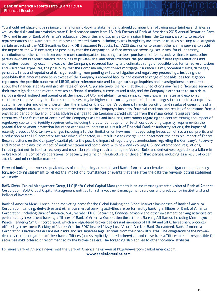 Bank of America Reports First-Quarter 2016 Financial Results 11 You should not place undue reliance on any forward-looking statement and should consider the following uncertainties and risks, as well as the risks and uncertainties more fully discussed under Item 1A. Risk Factors of Bank of America's 2015 Annual Report on Form 10-K, and in any of Bank of America's subsequent Securities and Exchange Commission filings: the Company's ability to resolve representations and warranties repurchase and related claims, including claims brought by investors or trustees seeking to distinguish certain aspects of the ACE Securities Corp. v. DB Structured Products, Inc. (ACE) decision or to assert other claims seeking to avoid the impact of the ACE decision; the possibility that the Company could face increased servicing, securities, fraud, indemnity, contribution or other claims from one or more counterparties, including trustees, purchasers of loans, underwriters, issuers, other parties involved in securitizations, monolines or private-label and other investors; the possibility that future representations and warranties losses may occur in excess of the Company’s recorded liability and estimated range of possible loss for its representations and warranties exposures; the possibility that the Company may not collect mortgage insurance claims; potential claims, damages, penalties, fines and reputational damage resulting from pending or future litigation and regulatory proceedings, including the possibility that amounts may be in excess of the Company’s recorded liability and estimated range of possible loss for litigation exposures; the possible outcome of LIBOR, other reference rate and foreign exchange inquiries and investigations; uncertainties about the financial stability and growth rates of non-U.S. jurisdictions, the risk that those jurisdictions may face difficulties servicing their sovereign debt, and related stresses on financial markets, currencies and trade, and the Company’s exposures to such risks, including direct, indirect and operational; the impact of U.S. and global interest rates, currency exchange rates and economic conditions; the possibility that future credit losses may be higher than currently expected due to changes in economic assumptions, customer behavior and other uncertainties; the impact on the Company’s business, financial condition and results of operations of a potential higher interest rate environment; the impact on the Company’s business, financial condition and results of operations from a protracted period of lower oil prices; adverse changes to the Company’s credit ratings from the major credit rating agencies; estimates of the fair value of certain of the Company’s assets and liabilities; uncertainty regarding the content, timing and impact of regulatory capital and liquidity requirements, including the potential adoption of total loss-absorbing capacity requirements; the potential for payment protection insurance exposure to increase as a result of Financial Conduct Authority actions; the impact of recently proposed U.K. tax law changes including a further limitation on how much net operating losses can offset annual profits and a reduction to the U.K. corporate tax rate which, if enacted, will result in a tax charge upon enactment; the possible impact of Federal Reserve actions on the Company’s capital plans; the possible impact of regulatory determinations regarding the Company’s Recovery and Resolution plans; the impact of implementation and compliance with new and evolving U.S. and international regulations, including, but not limited to, recovery and resolution planning requirements, the Volcker Rule, and derivatives regulations; a failure in or breach of the Company’s operational or security systems or infrastructure, or those of third parties, including as a result of cyber attacks; and other similar matters. Forward-looking statements speak only as of the date they are made, and Bank of America undertakes no obligation to update any forward-looking statement to reflect the impact of circumstances or events that arise after the date the forward-looking statement was made. BofA Global Capital Management Group, LLC (BofA Global Capital Management) is an asset management division of Bank of America Corporation. BofA Global Capital Management entities furnish investment management services and products for institutional and individual investors. Bank of America Merrill Lynch is the marketing name for the Global Banking and Global Markets businesses of Bank of America Corporation. Lending, derivatives and other commercial banking activities are performed by banking affiliates of Bank of America Corporation, including Bank of America, N.A., member FDIC. Securities, financial advisory and other investment banking activities are performed by investment banking affiliates of Bank of America Corporation (Investment Banking Affiliates), including Merrill Lynch, Pierce, Fenner & Smith Incorporated, which are registered broker-dealers and members of FINRA and SIPC. Investment products offered by Investment Banking Affiliates: Are Not FDIC Insured * May Lose Value * Are Not Bank Guaranteed. Bank of America Corporation's broker-dealers are not banks and are separate legal entities from their bank affiliates. The obligations of the broker- dealers are not obligations of their bank affiliates (unless explicitly stated otherwise), and these bank affiliates are not responsible for securities sold, offered or recommended by the broker-dealers. The foregoing also applies to other non-bank affiliates. For more Bank of America news, visit the Bank of America newsroom at http://newsroom.bankofamerica.com. www.bankofamerica.com