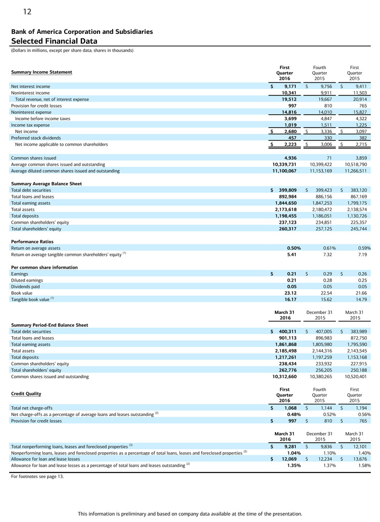 This information is preliminary and based on company data available at the time of the presentation. 12 Bank of America Corporation and Subsidiaries Selected Financial Data (Dollars in millions, except per share data; shares in thousands) Summary Income Statement First Quarter 2016 Fourth Quarter 2015 First Quarter 2015 Net interest income $ 9,171 $ 9,756 $ 9,411 Noninterest income 10,341 9,911 11,503 Total revenue, net of interest expense 19,512 19,667 20,914 Provision for credit losses 997 810 765 Noninterest expense 14,816 14,010 15,827 Income before income taxes 3,699 4,847 4,322 Income tax expense 1,019 1,511 1,225 Net income $ 2,680 $ 3,336 $ 3,097 Preferred stock dividends 457 330 382 Net income applicable to common shareholders $ 2,223 $ 3,006 $ 2,715 Common shares issued 4,936 71 3,859 Average common shares issued and outstanding 10,339,731 10,399,422 10,518,790 Average diluted common shares issued and outstanding 11,100,067 11,153,169 11,266,511 Summary Average Balance Sheet Total debt securities $ 399,809 $ 399,423 $ 383,120 Total loans and leases 892,984 886,156 867,169 Total earning assets 1,844,650 1,847,253 1,799,175 Total assets 2,173,618 2,180,472 2,138,574 Total deposits 1,198,455 1,186,051 1,130,726 Common shareholders’ equity 237,123 234,851 225,357 Total shareholders’ equity 260,317 257,125 245,744 Performance Ratios Return on average assets 0.50% 0.61% 0.59% Return on average tangible common shareholders’ equity (1) 5.41 7.32 7.19 Per common share information Earnings $ 0.21 $ 0.29 $ 0.26 Diluted earnings 0.21 0.28 0.25 Dividends paid 0.05 0.05 0.05 Book value 23.12 22.54 21.66 Tangible book value (1) 16.17 15.62 14.79 March 31 2016 December 31 2015 March 31 2015 Summary Period-End Balance Sheet Total debt securities $ 400,311 $ 407,005 $ 383,989 Total loans and leases 901,113 896,983 872,750 Total earning assets 1,861,868 1,805,980 1,795,590 Total assets 2,185,498 2,144,316 2,143,545 Total deposits 1,217,261 1,197,259 1,153,168 Common shareholders’ equity 238,434 233,932 227,915 Total shareholders’ equity 262,776 256,205 250,188 Common shares issued and outstanding 10,312,660 10,380,265 10,520,401 Credit Quality First Quarter 2016 Fourth Quarter 2015 First Quarter 2015 Total net charge-offs $ 1,068 $ 1,144 $ 1,194 Net charge-offs as a percentage of average loans and leases outstanding (2) 0.48% 0.52% 0.56% Provision for credit losses $ 997 $ 810 $ 765 March 31 2016 December 31 2015 March 31 2015 Total nonperforming loans, leases and foreclosed properties (3) $ 9,281 $ 9,836 $ 12,101 Nonperforming loans, leases and foreclosed properties as a percentage of total loans, leases and foreclosed properties (2) 1.04% 1.10% 1.40% Allowance for loan and lease losses $ 12,069 $ 12,234 $ 13,676 Allowance for loan and lease losses as a percentage of total loans and leases outstanding (2) 1.35% 1.37% 1.58% For footnotes see page 13.