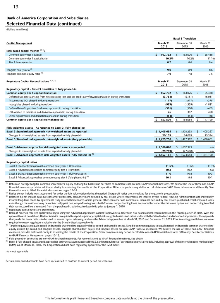 This information is preliminary and based on company data available at the time of the presentation. 13 Bank of America Corporation and Subsidiaries Selected Financial Data (continued) (Dollars in millions) Basel 3 Transition Capital Management March 31 2016 December 31 2015 March 31 2015 Risk-based capital metrics (4, 5): Common equity tier 1 capital $ 162,732 $ 163,026 $ 155,438 Common equity tier 1 capital ratio 10.3% 10.2% 11.1% Tier 1 leverage ratio 8.7 8.6 8.4 Tangible equity ratio (6) 9.0 8.9 8.6 Tangible common equity ratio (6) 7.9 7.8 7.5 Regulatory Capital Reconciliations (4, 5, 7) March 31 2016 December 31 2015 March 31 2015 Regulatory capital – Basel 3 transition to fully phased-in Common equity tier 1 capital (transition) $ 162,732 $ 163,026 $ 155,438 Deferred tax assets arising from net operating loss and tax credit carryforwards phased in during transition (3,764) (5,151) (6,031) Accumulated OCI phased in during transition (117) (1,917) (378) Intangibles phased in during transition (983) (1,559) (1,821) Defined benefit pension fund assets phased in during transition (381) (568) (459) DVA related to liabilities and derivatives phased in during transition 76 307 498 Other adjustments and deductions phased in during transition (54) (54) (48) Common equity tier 1 capital (fully phased-in) $ 157,509 $ 154,084 $ 147,199 Risk-weighted assets – As reported to Basel 3 (fully phased-in) Basel 3 Standardized approach risk-weighted assets as reported $ 1,405,655 $ 1,403,293 $ 1,405,267 Changes in risk-weighted assets from reported to fully phased-in 20,103 24,089 25,394 Basel 3 Standardized approach risk-weighted assets (fully phased-in) $ 1,425,758 $ 1,427,382 $ 1,430,661 Basel 3 Advanced approaches risk-weighted assets as reported $ 1,586,870 $ 1,602,373 n/a Changes in risk-weighted assets from reported to fully phased-in (29,709) (27,690) n/a Basel 3 Advanced approaches risk-weighted assets (fully phased-in) (8) $ 1,557,161 $ 1,574,683 $ 1,461,190 Regulatory capital ratios Basel 3 Standardized approach common equity tier 1 (transition) 11.6% 11.6% 11.1% Basel 3 Advanced approaches common equity tier 1 (transition) 10.3 10.2 n/a Basel 3 Standardized approach common equity tier 1 (fully phased-in) 11.0 10.8 10.3 Basel 3 Advanced approaches common equity tier 1 (fully phased-in) (8) 10.1 9.8 10.1 (1) Return on average tangible common shareholders' equity and tangible book value per share of common stock are non-GAAP financial measures. We believe the use of these non-GAAP financial measures provides additional clarity in assessing the results of the Corporation. Other companies may define or calculate non-GAAP financial measures differently. See Reconciliations to GAAP Financial Measures on pages 16-18. (2) Ratios do not include loans accounted for under the fair value option during the period. Charge-off ratios are annualized for the quarterly presentation. (3) Balances do not include past due consumer credit card, consumer loans secured by real estate where repayments are insured by the Federal Housing Administration and individually insured long-term stand-by agreements (fully-insured home loans), and in general, other consumer and commercial loans not secured by real estate; purchased credit-impaired loans even though the customer may be contractually past due; nonperforming loans held-for-sale; nonperforming loans accounted for under the fair value option; and nonaccruing troubled debt restructured loans removed from the purchased credit-impaired portfolio prior to January 1, 2010. (4) Regulatory capital ratios are preliminary. (5) Bank of America received approval to begin using the Advanced approaches capital framework to determine risk-based capital requirements in the fourth quarter of 2015. With the approval to exit parallel run, Bank of America is required to report regulatory capital risk-weighted assets and ratios under both the Standardized and Advanced approaches. The approach that yields the lower ratio is to be used to assess capital adequacy, and was the Advanced approaches at March 31, 2016 and December 31, 2015. Prior to exiting parallel run, we were required to report regulatory capital under the Standardized approach only. (6) Tangible equity ratio equals period-end tangible shareholders' equity divided by period-end tangible assets. Tangible common equity ratio equals period-end tangible common shareholders' equity divided by period-end tangible assets. Tangible shareholders' equity and tangible assets are non-GAAP financial measures. We believe the use of these non-GAAP financial measures provides additional clarity in assessing the results of the Corporation. Other companies may define or calculate non-GAAP financial measures differently. See Reconciliations to GAAP Financial Measures on pages 16-18. (7) Fully phased-in estimates are non-GAAP financial measures. For reconciliations to GAAP financial measures, see above. (8) Basel 3 fully phased-in Advanced approaches estimates assume approval by U.S. banking regulators of our internal analytical models, including approval of the internal models methodology (IMM). As of March 31, 2016, the Corporation did not have regulatory approval for the IMM model. n/a = not applicable Certain prior period amounts have been reclassified to conform to current period presentation.