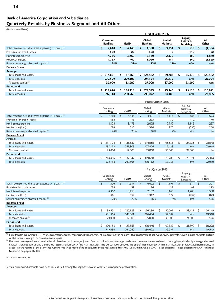 This information is preliminary and based on company data available at the time of the presentation. 14 Bank of America Corporation and Subsidiaries Quarterly Results by Business Segment and All Other (Dollars in millions) First Quarter 2016 Consumer Banking GWIM Global Banking Global Markets Legacy Assets & Servicing All Other Total revenue, net of interest expense (FTE basis) (1) $ 7,648 $ 4,445 $ 4,398 $ 3,951 $ 679 $ (1,394) Provision for credit losses 560 25 553 9 (118) (32) Noninterest expense 4,266 3,250 2,159 2,432 860 1,849 Net income (loss) 1,785 740 1,066 984 (40) (1,855) Return on average allocated capital (2) 24% 23% 12% 11% n/m n/m Balance Sheet Average Total loans and leases $ 214,821 $ 137,868 $ 324,552 $ 69,283 $ 25,878 $ 120,582 Total deposits 572,660 260,482 297,134 36,173 n/m 23,964 Allocated capital (2) 30,000 13,000 37,000 37,000 23,000 n/m Period end Total loans and leases $ 217,620 $ 138,418 $ 329,543 $ 73,446 $ 25,115 $ 116,971 Total deposits 592,118 260,565 298,072 34,486 n/m 23,885 Fourth Quarter 2015 Consumer Banking GWIM Global Banking Global Markets Legacy Assets & Servicing All Other Total revenue, net of interest expense (FTE basis) (1) $ 7,760 $ 4,444 $ 4,491 $ 3,113 $ 588 $ (503) Provision for credit losses 682 15 233 30 (10) (140) Noninterest expense 4,325 3,475 2,075 2,752 1,146 237 Net income (loss) 1,774 616 1,378 178 (350) (260) Return on average allocated capital (2) 24% 20% 16% 2% n/m n/m Balance Sheet Average Total loans and leases $ 211,126 $ 135,839 $ 314,585 $ 68,835 $ 27,223 $ 128,548 Total deposits 557,318 251,306 307,806 37,423 n/m 22,948 Allocated capital (2) 29,000 12,000 35,000 35,000 24,000 n/m Period end Total loans and leases $ 214,405 $ 137,847 $ 319,658 $ 73,208 $ 26,521 $ 125,344 Total deposits 572,738 260,893 296,162 37,256 n/m 22,919 First Quarter 2015 Consumer Banking GWIM Global Banking Global Markets Legacy Assets & Servicing All Other Total revenue, net of interest expense (FTE basis) (1) $ 7,406 $ 4,517 $ 4,402 $ 4,191 $ 914 $ (301) Provision for credit losses 716 23 96 21 91 (182) Noninterest expense 4,367 3,458 2,132 3,140 1,200 1,530 Net income (loss) 1,461 652 1,367 677 (237) (823) Return on average allocated capital (2) 20% 22% 16% 8% n/m n/m Balance Sheet Average Total loans and leases $ 199,581 $ 126,129 $ 284,298 $ 56,601 $ 32,411 $ 168,149 Total deposits 531,365 243,561 286,434 39,587 n/m 19,518 Allocated capital (2) 29,000 12,000 35,000 35,000 24,000 n/m Period end Total loans and leases $ 200,153 $ 127,556 $ 290,446 $ 62,627 $ 31,690 $ 160,278 Total deposits 549,494 244,080 290,422 38,587 n/m 19,543 (1) Fully taxable-equivalent (FTE) basis is a performance measure used by management in operating the business that management believes provides investors with a more accurate picture of the interest margin for comparative purposes. (2) Return on average allocated capital is calculated as net income, adjusted for cost of funds and earnings credits and certain expenses related to intangibles, divided by average allocated capital. Allocated capital and the related return are non-GAAP financial measures. The Corporation believes the use of these non-GAAP financial measures provides additional clarity in assessing the results of the segments. Other companies may define or calculate these measures differently. (See Exhibit A: Non-GAAP Reconciliations - Reconciliations to GAAP Financial Measures on pages 16-18.) n/m = not meaningful Certain prior period amounts have been reclassified among the segments to conform to current period presentation.