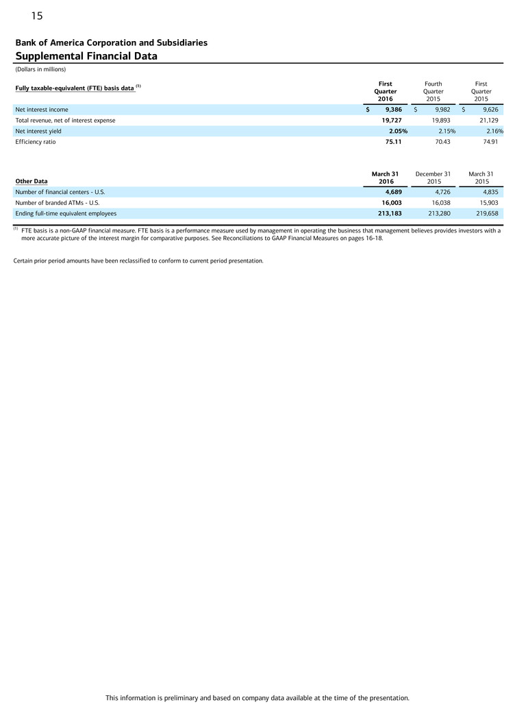 This information is preliminary and based on company data available at the time of the presentation. 15 Bank of America Corporation and Subsidiaries Supplemental Financial Data (Dollars in millions) Fully taxable-equivalent (FTE) basis data (1) FirstQuarter 2016 Fourth Quarter 2015 First Quarter 2015 Net interest income $ 9,386 $ 9,982 $ 9,626 Total revenue, net of interest expense 19,727 19,893 21,129 Net interest yield 2.05% 2.15% 2.16% Efficiency ratio 75.11 70.43 74.91 Other Data March 31 2016 December 31 2015 March 31 2015 Number of financial centers - U.S. 4,689 4,726 4,835 Number of branded ATMs - U.S. 16,003 16,038 15,903 Ending full-time equivalent employees 213,183 213,280 219,658 (1) FTE basis is a non-GAAP financial measure. FTE basis is a performance measure used by management in operating the business that management believes provides investors with a more accurate picture of the interest margin for comparative purposes. See Reconciliations to GAAP Financial Measures on pages 16-18. Certain prior period amounts have been reclassified to conform to current period presentation.